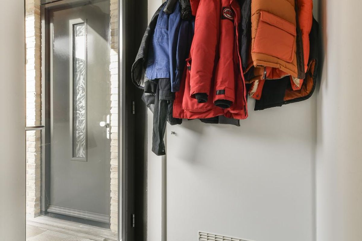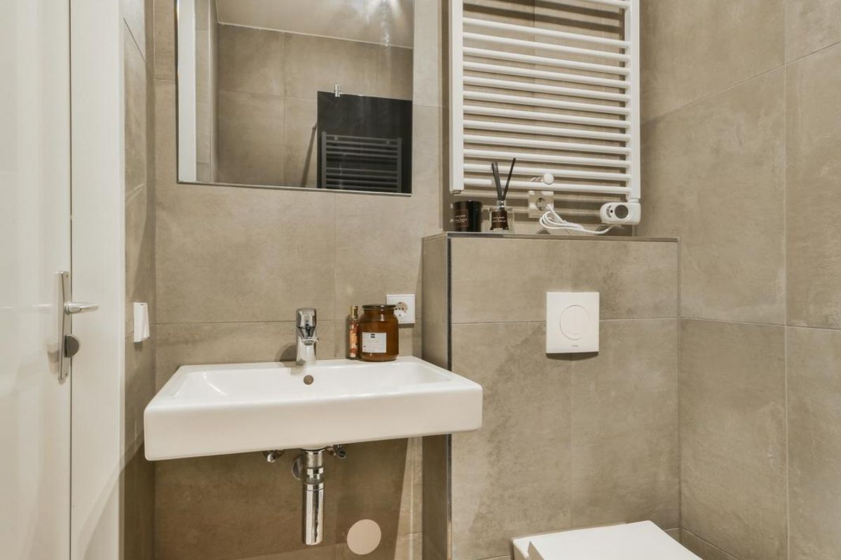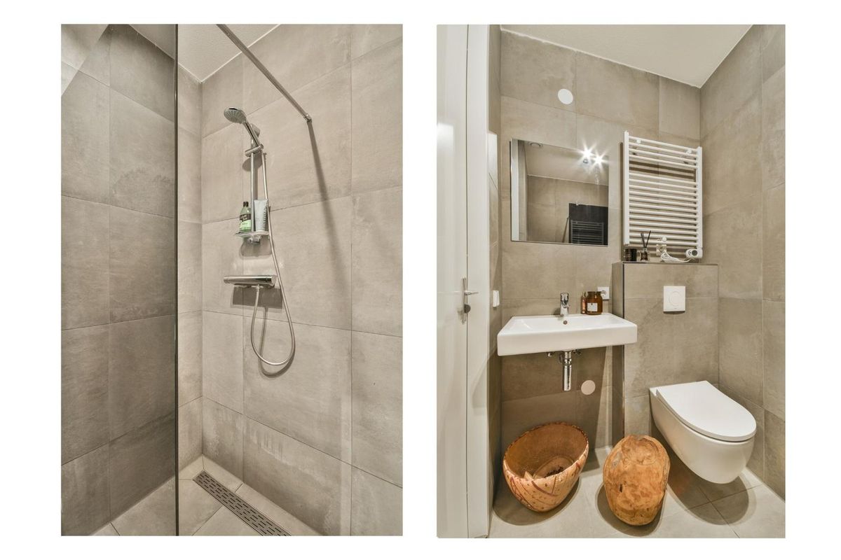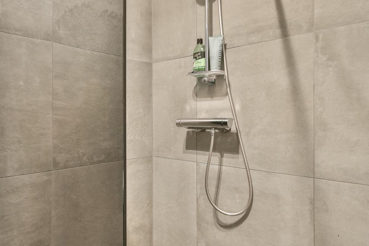 Wanneer je de badkamer wilt betreden, doe je dat via een kleine hal. In deze hal vind je ook een praktische provisieruimte en de aansluiting voor de wasmachine, zodat alles netjes is georganiseerd en uit het zicht blijft. De badkamer zelf is modern afgewerkt en voorzien van een inloopdouche, wastafel, toilet en handdoekradiator — een fijne plek om je dag te beginnen of ontspannen af te sluiten.