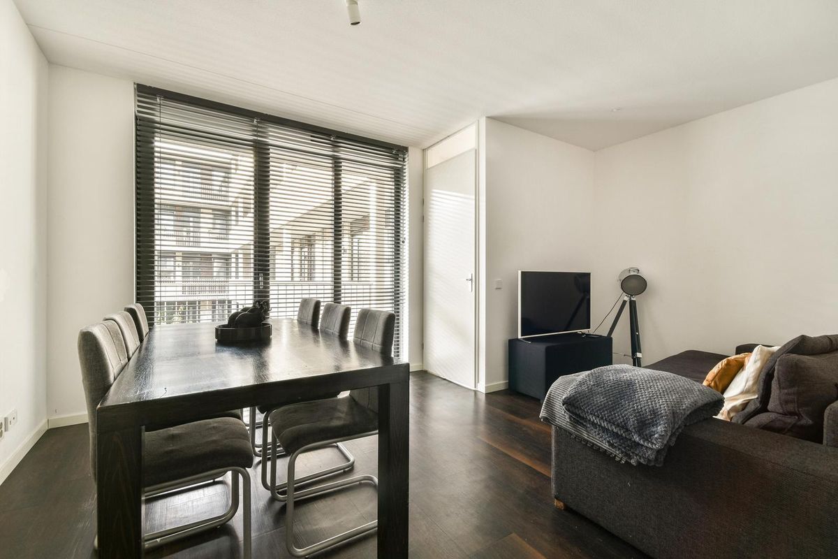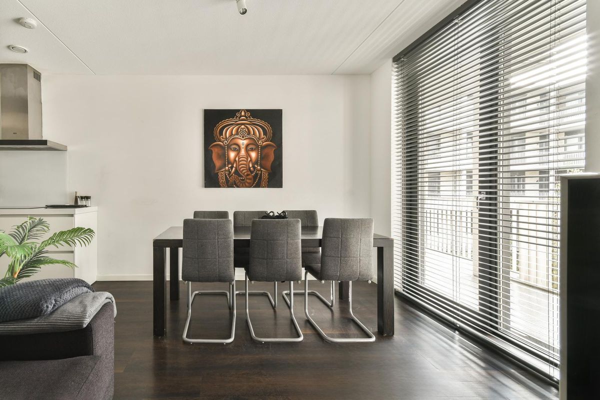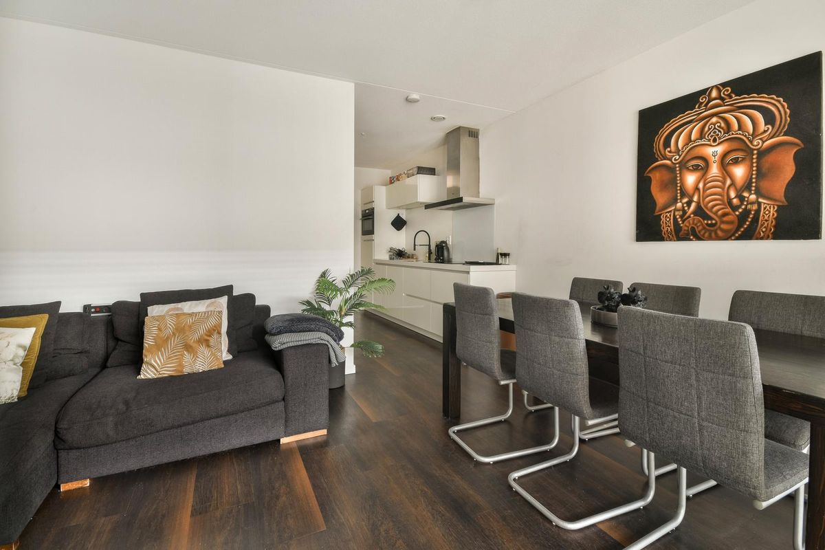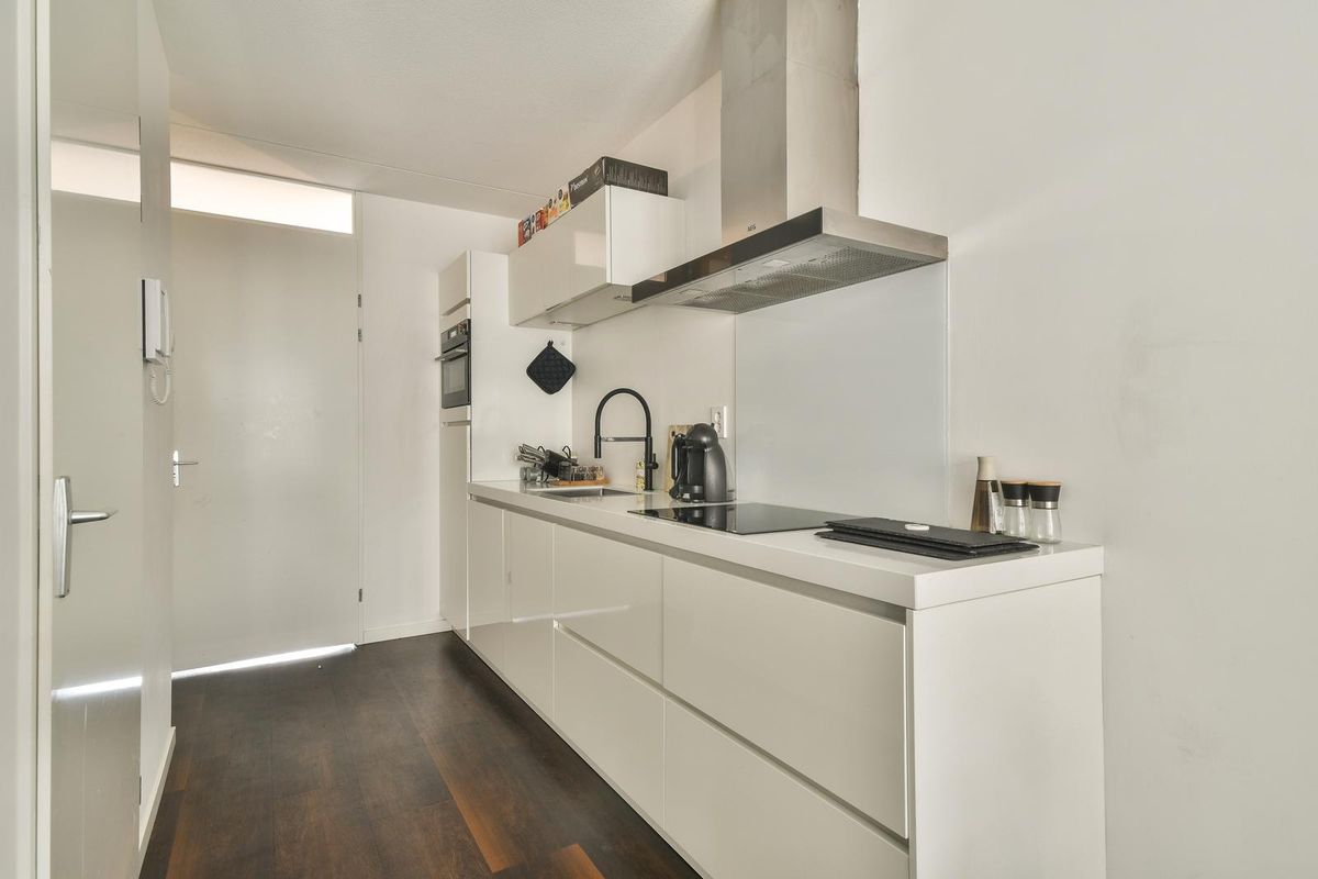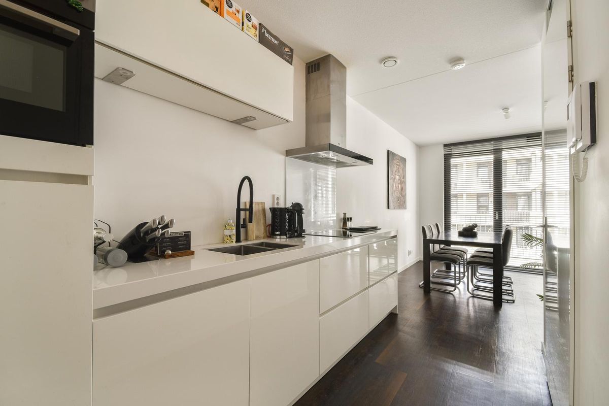 Je stapt binnen in de hal met toegang tot de lichte woonkamer. De woonkamer met open keuken vormt het hart van het appartement. Hier geniet je van een fijne sfeer en veel lichtinval dankzij de grote ramen. De moderne keuken in witte tinten is uitgerust met diverse inbouwapparatuur. Ideaal voor de thuiskok.