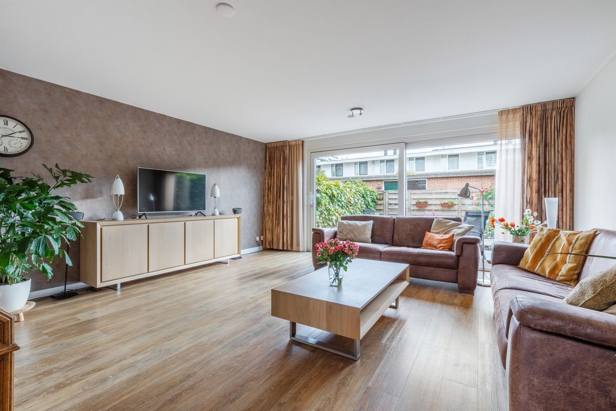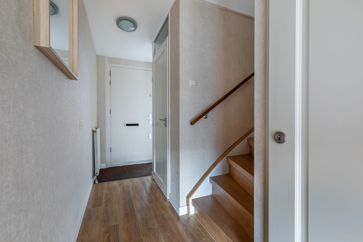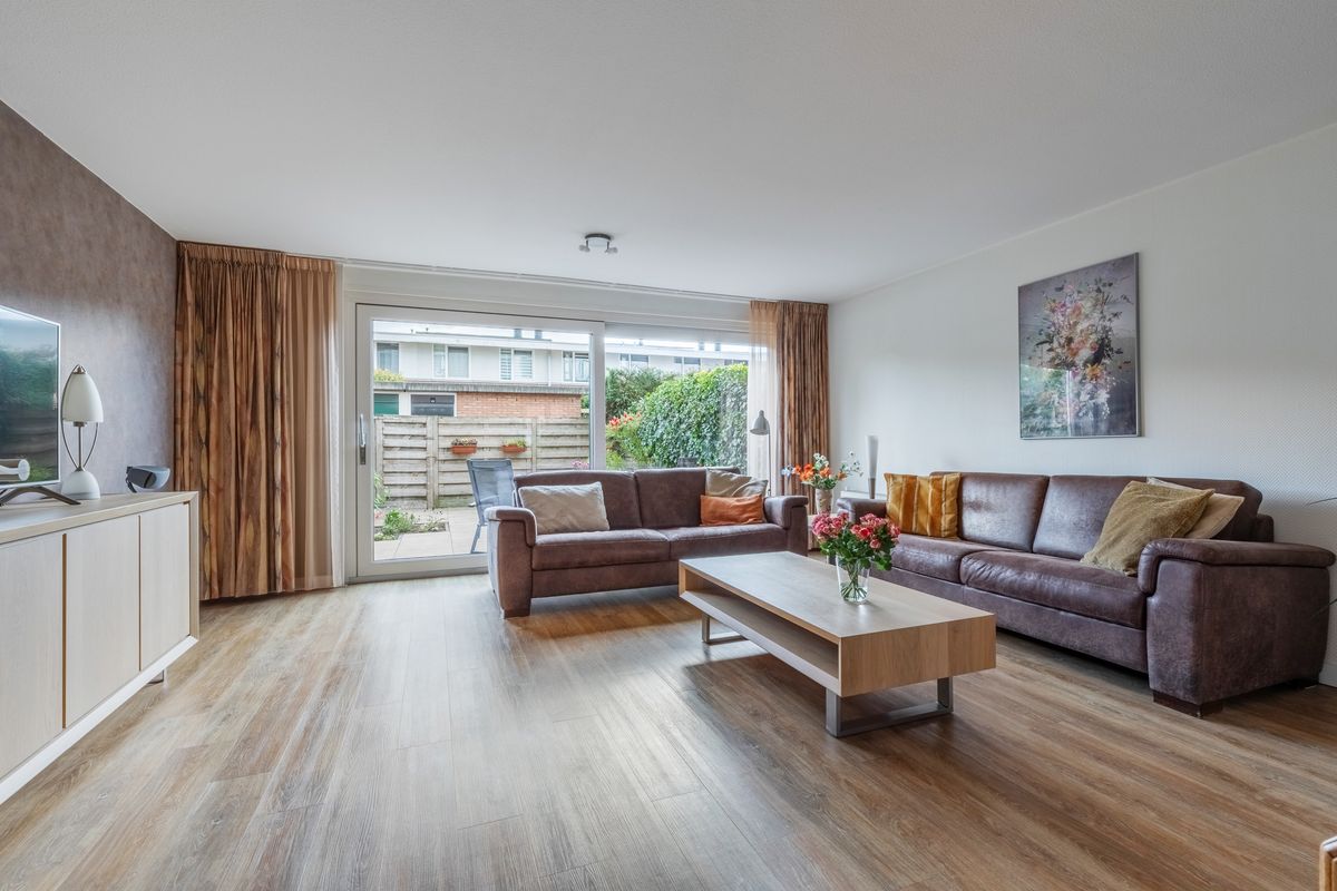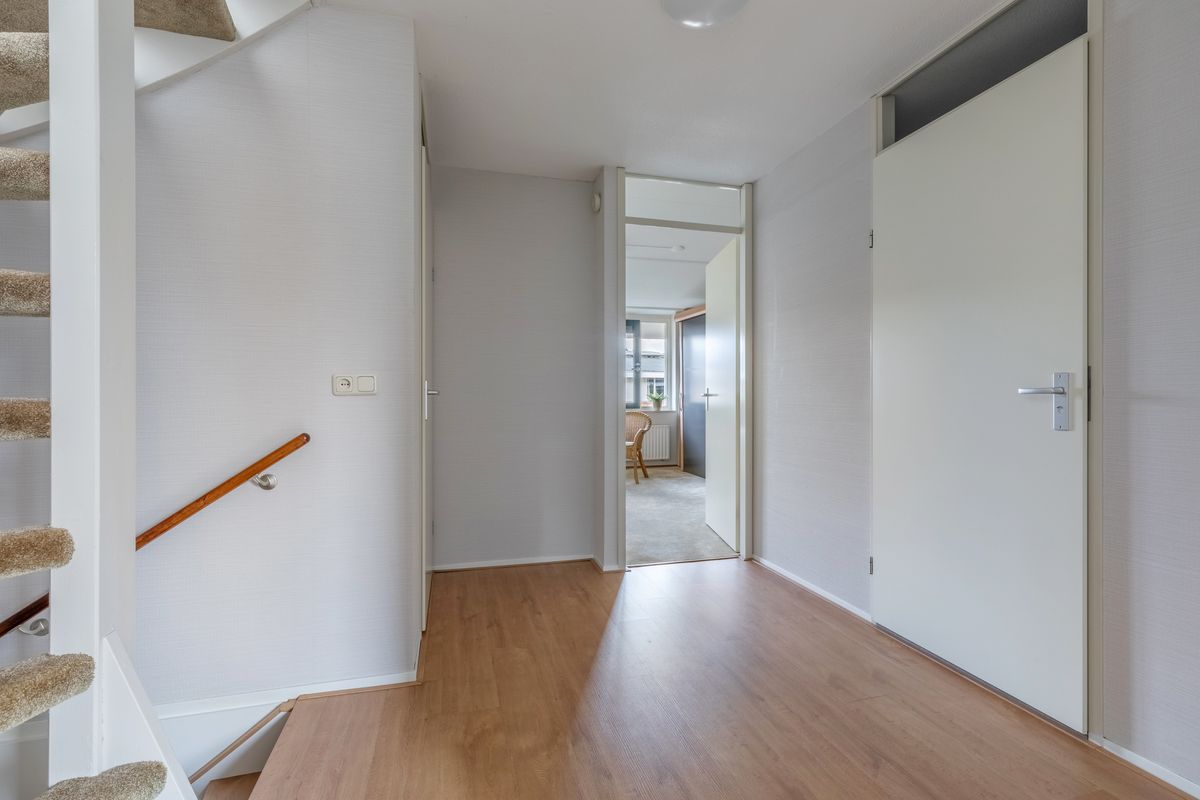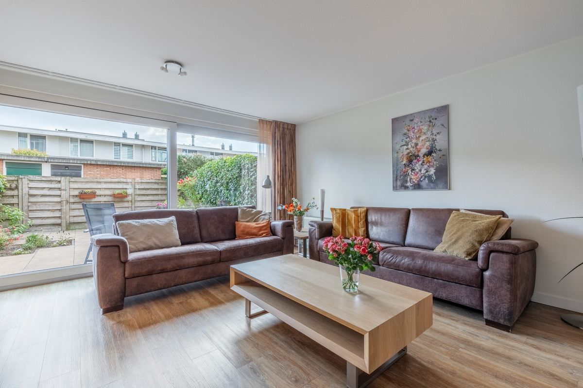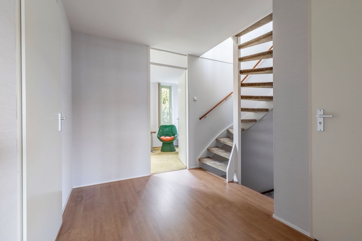Bij binnenkomst stap je de ruime hal binnen met garderoberuimte, toilet en trap naar boven. De royale woonkamer is licht, sfeervol en voorzien van een pvc-vloer. Via de schuifpui loop je zo de zonnige tuin op het zuiden in, waar je volop privacy hebt. De tuin heeft een achterom, een elektrisch bedienbaar zonnescherm en een aparte stenen berging met elektra.