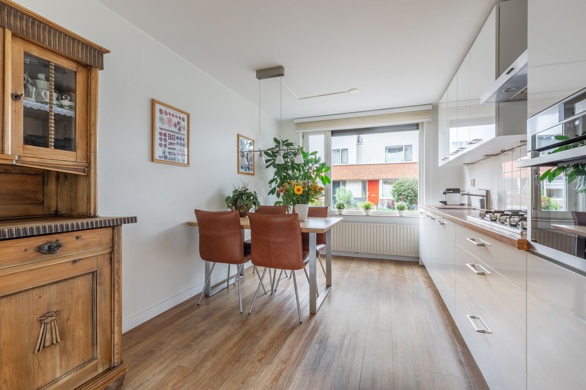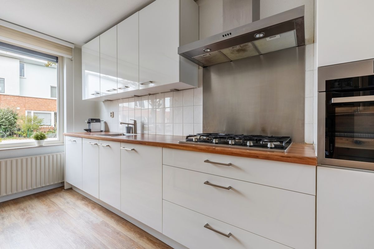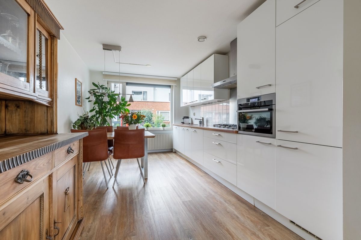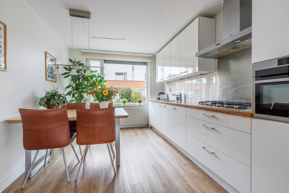 Upon entering, you step into the spacious hallway with coat space, a toilet, and stairs to the upper floor. The generous living room is bright and welcoming, featuring a PVC floor. Through the sliding doors, you step directly into the sunny south-facing garden, where you can enjoy complete privacy. The garden includes a back entrance, an electric sunshade, and a separate brick shed with electricity. At the front of the house, you’ll find the kitchen, designed in a straight layout. It’s equipped with a combi oven, five-burner gas hob, fridge-freezer, and dishwasher. The large window lets in plenty of natural light and provides surprising storage space.