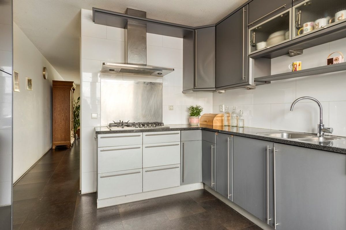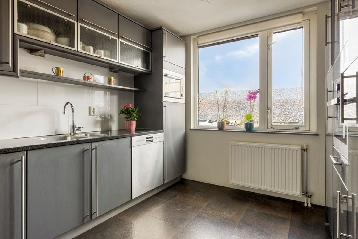 Aan de voorzijde van de woning bevindt zich de keuken, uitgevoerd met een granieten aanrechtblad en diverse inbouwapparatuur. De keuken is voorzien van een 5-pits gaskookplaat, afzuigkap, vaatwasser en een koel-/vriescombinatie. Een praktische en fijne plek om te koken met uitzicht op de rustige straat.
