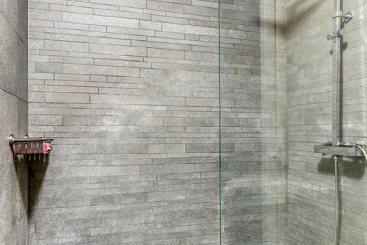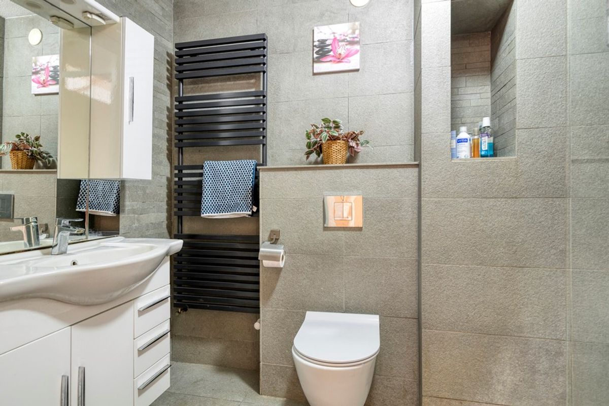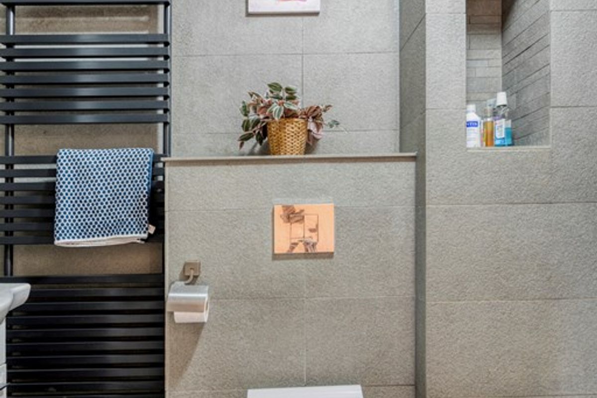 De moderne badkamer uit 2017 is strak afgewerkt en volledig betegeld. Hier beschik je over een ruime inloopdouche met rainshower, een breed wastafelmeubel, een zwevend toilet en een handdoekradiator.