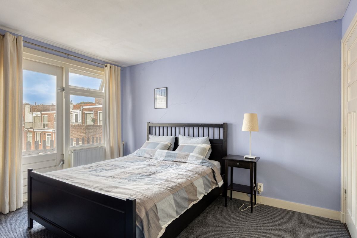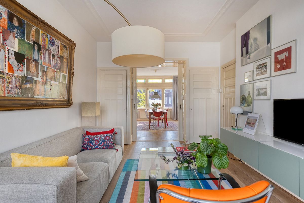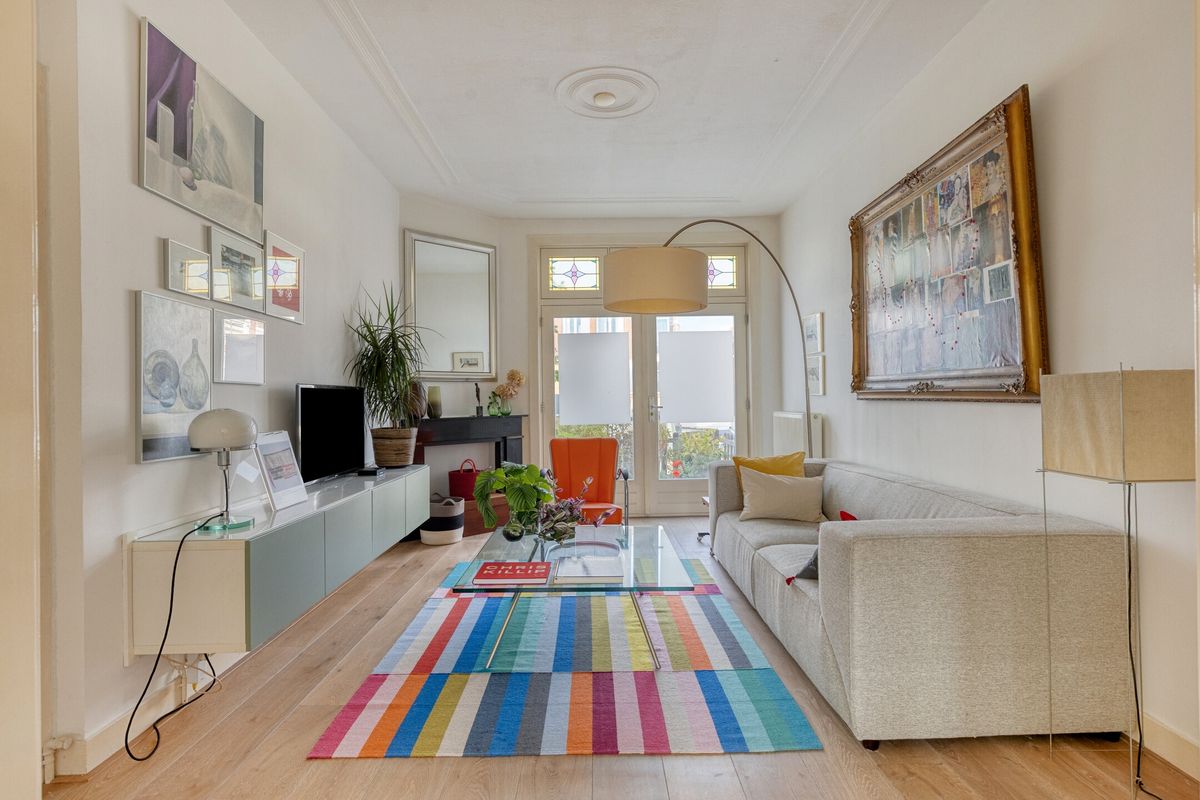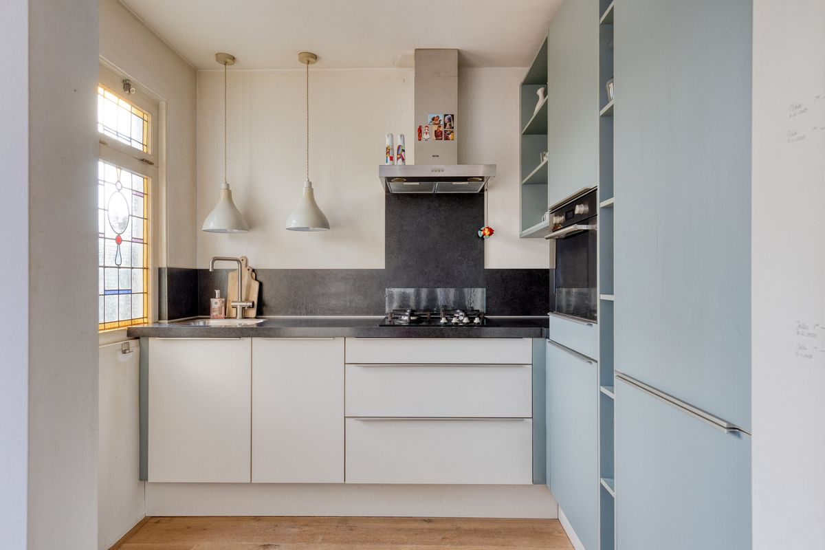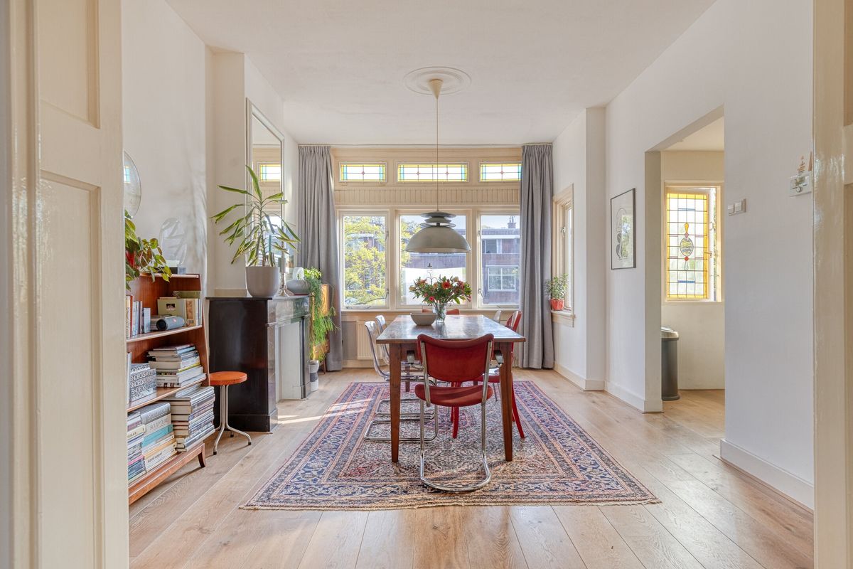 Middels de overloop met de trap naar tweede etage heeft u toegang tot de toiletruimte met fonteintje en de sfeervolle en ruim opgezette woon-/eetkamer met zijn klassieke schuifdeuren waardoor die aangrenzende woonkamer met frans balkon en de eetkamer op een stijlvolle manier van elkaar kunnen worden scheiden. De aan de voorzijde gelegen open keuken van goed formaat heeft uitzicht via het originele glas-in-lood raam op de levendige Haagweg. De keuken is voorzien van een divers inbouwapparatuur o.a. een 4-pits gaskookplaat, RVS afzuigkap, combi-oven, vaatwasser en koel-vriescombinatie en voldoende kastruimte.