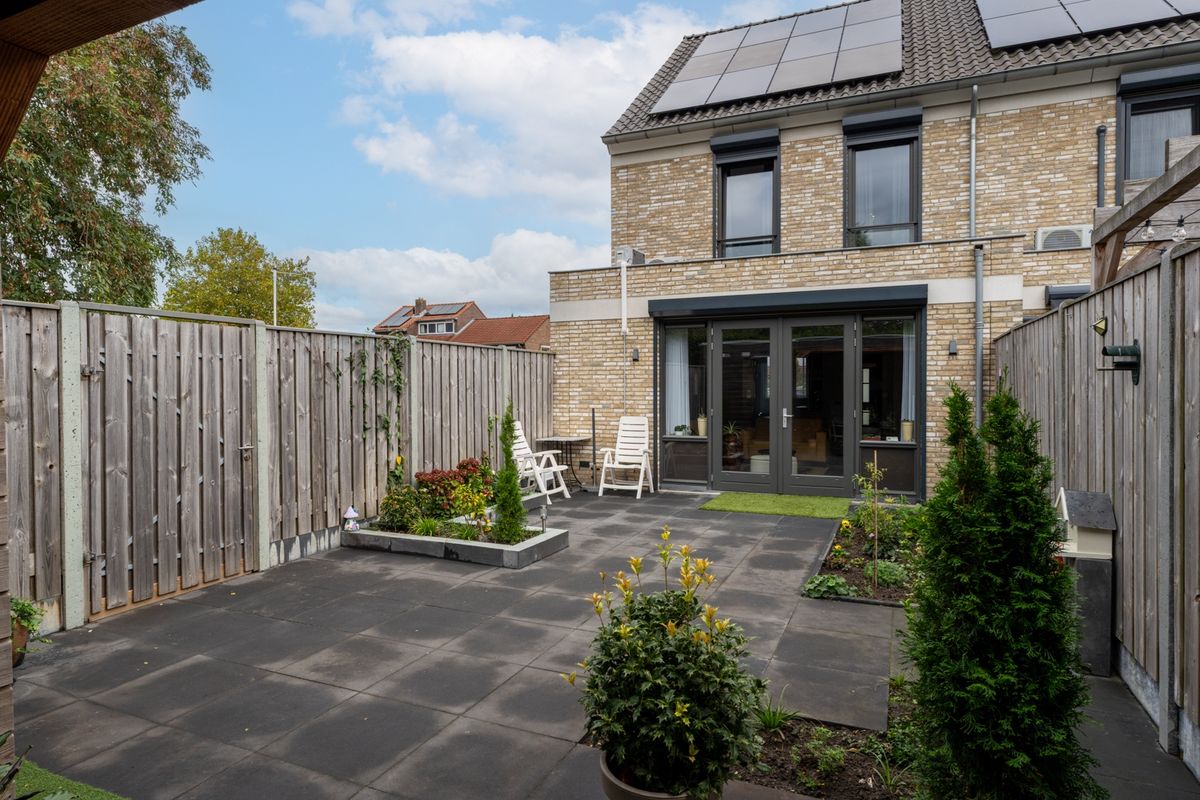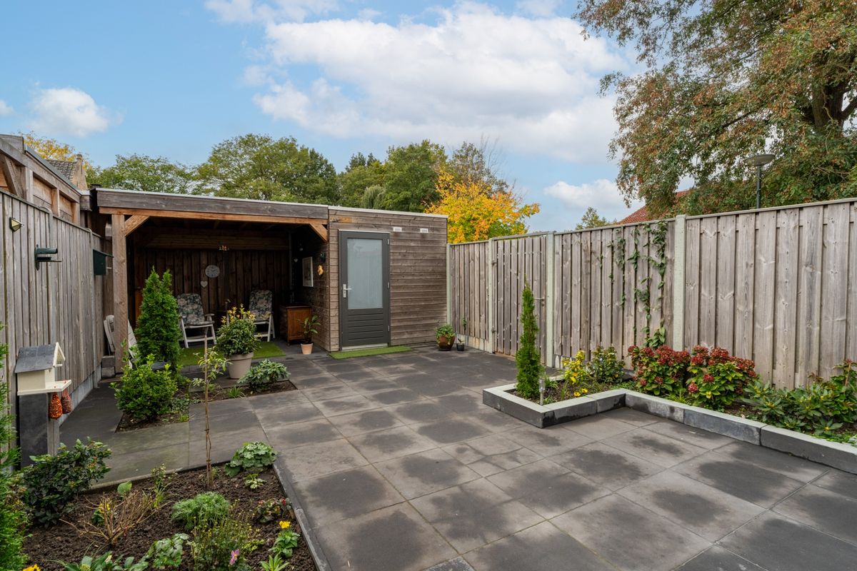 De omsloten achtertuin met achterom is ingericht met sierbestrating, plantenborders en achterop het perceel de berging. Tevens is er een mogelijkheid om een garage achterop het perceel te realiseren.