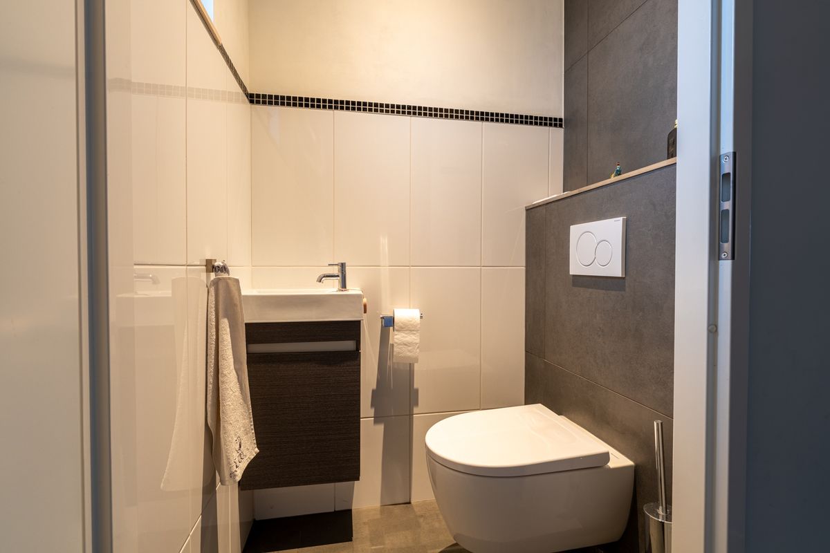Hal met toilet, meterkast, CV-kast (type Intergas, bouwjaar 2017), sfeervolle ruime woonkamer met provisiekast en openslaande deuren naar het terras en de achtertuin. Aan de voorzijde de moderne openkeuken met een dubbele opstelling voorzien van de volgende inbouwapparatuur: inductiekookplaat, afzuigkap, vaatwasser, combimagnetron, koelkast en vriezer. De spoelbak is voorzien van een Grohe 3-in-1 kraan. Er is voldoende kastruimte aanwezig met diverse handige lades en tevens een fijne wegkijk over het voorgelegen parkeerplein.