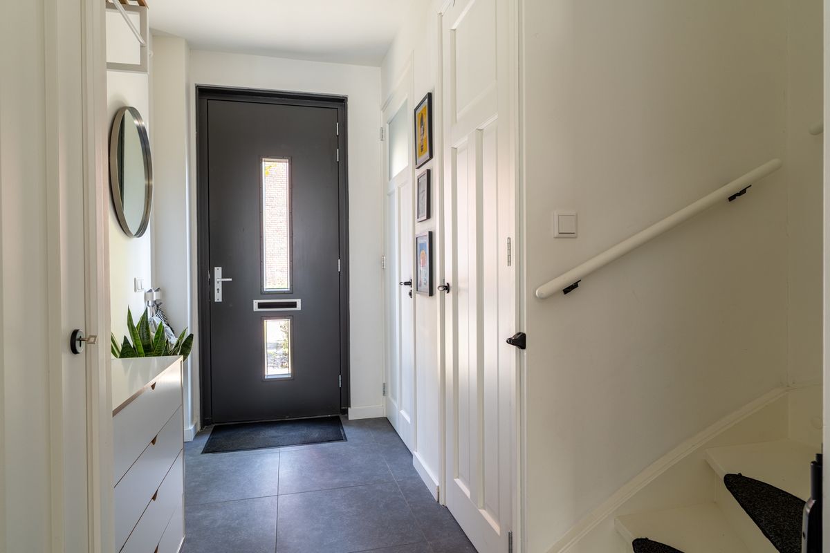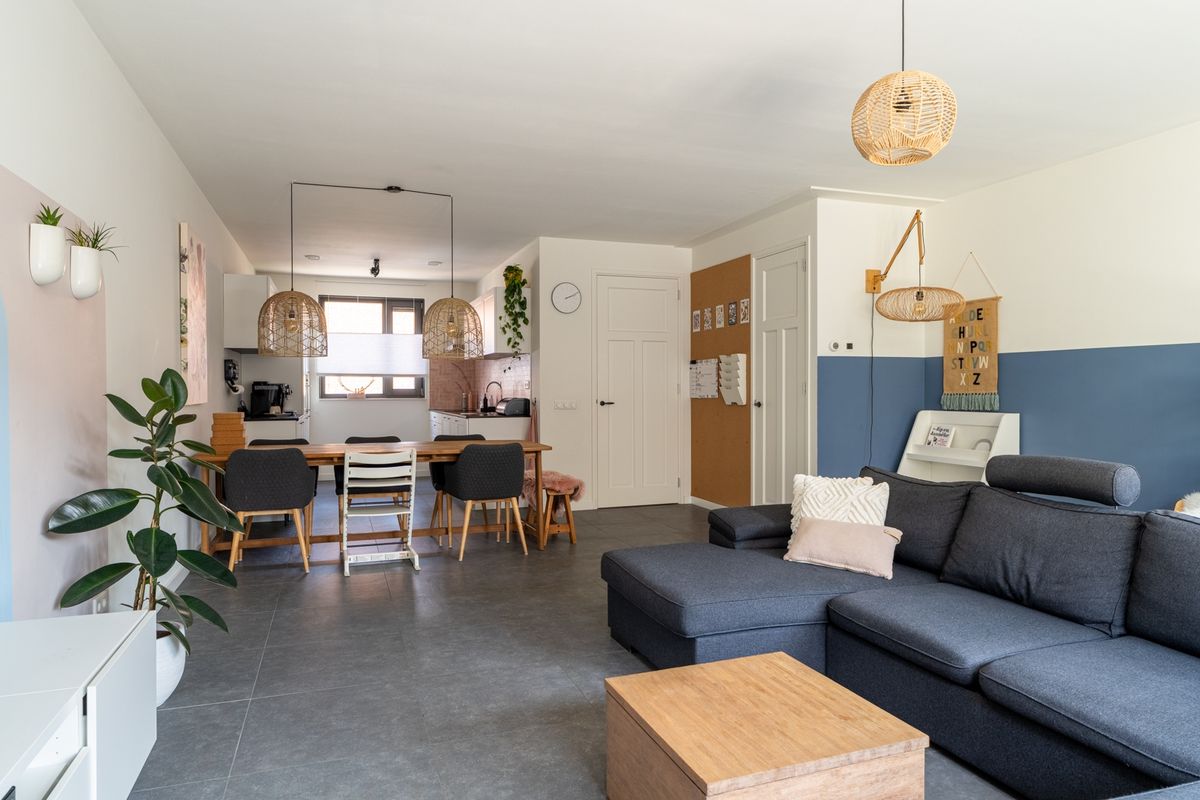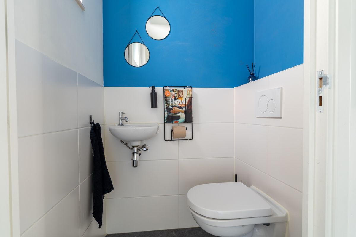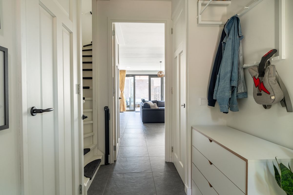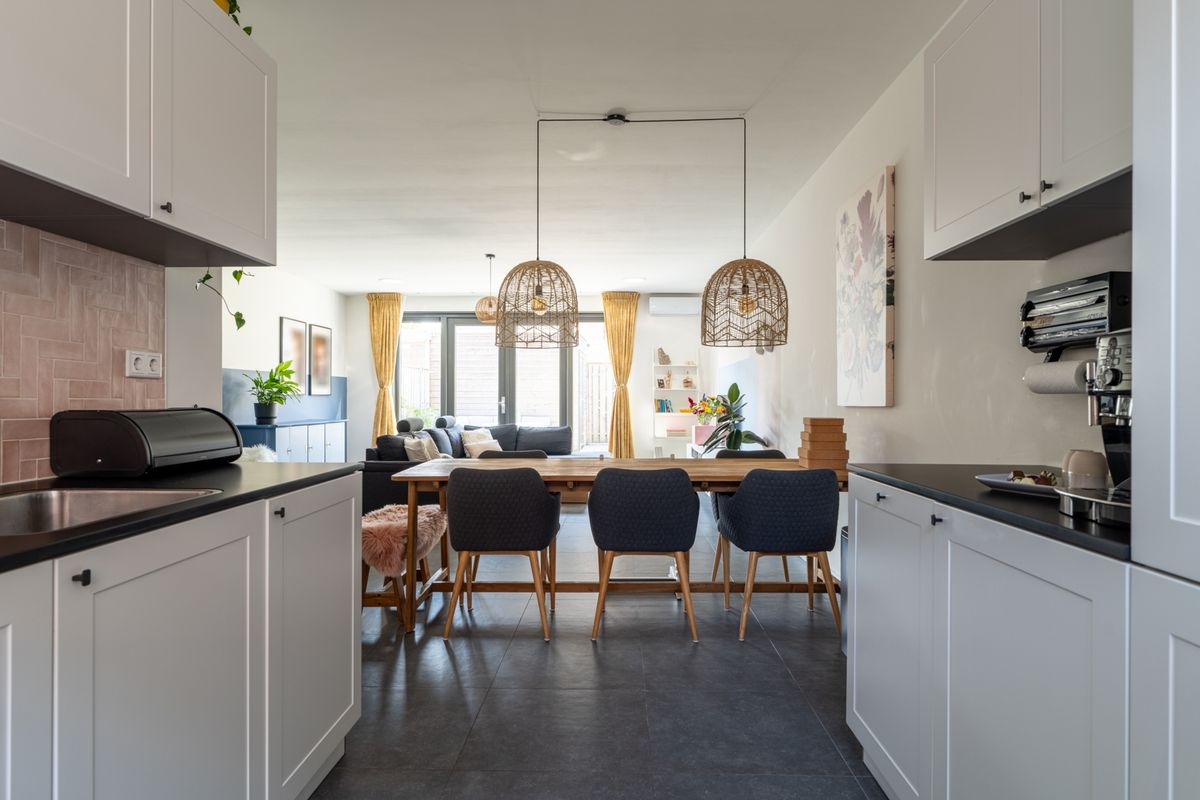 Hal met toilet, meterkast (10 groepen en 3 aardlekschakelaars), CV-kast (type Intergas, bouwjaar 2017) en de trapopgang naar de verdieping, sfeervolle uitgebouwde woonkamer met openslaande deuren naar het terras en de achtertuin. Aan de voorzijde is de moderne open keuken met een dubbele opstelling en voorzien van de volgende inbouwapparatuur: inductiekookplaat met afzuigkap, combimagnetron, vaatwasser, koelkast met vriesvak.