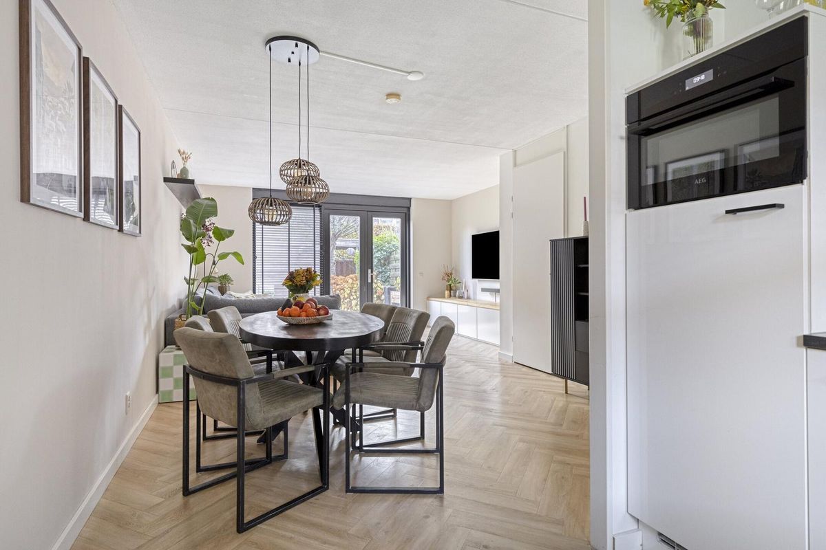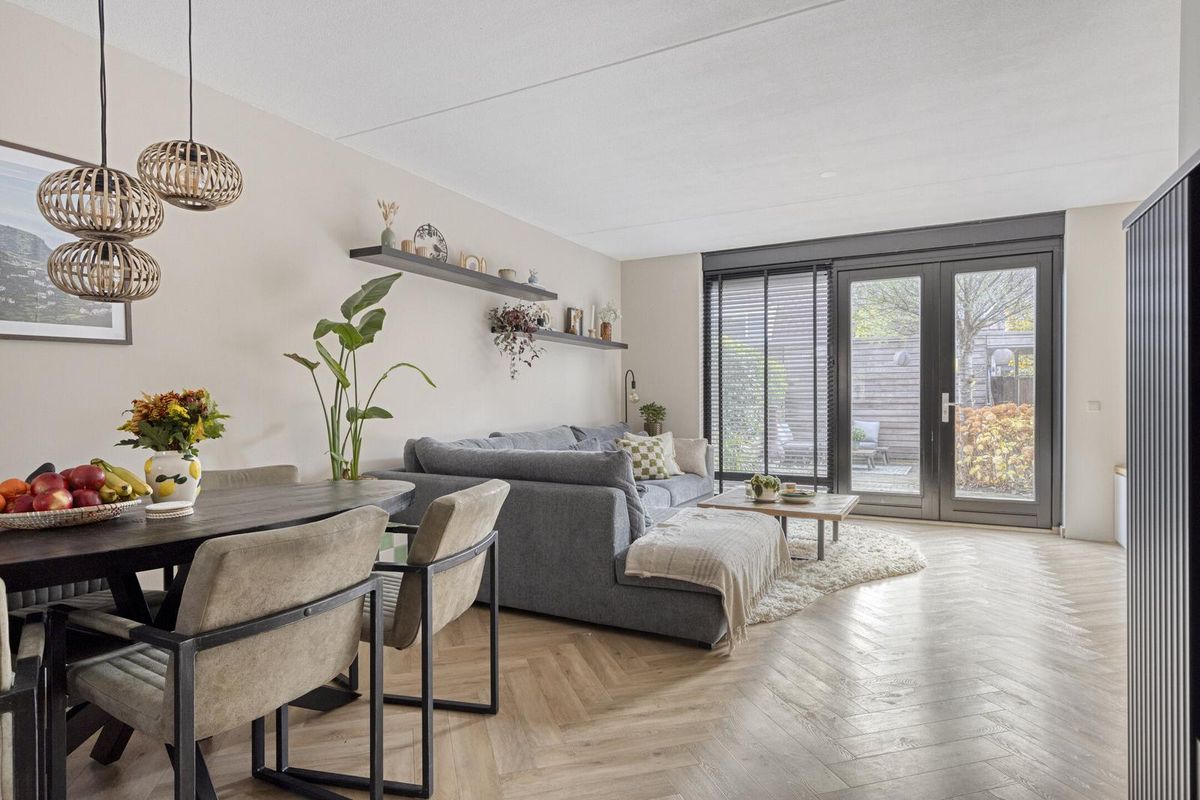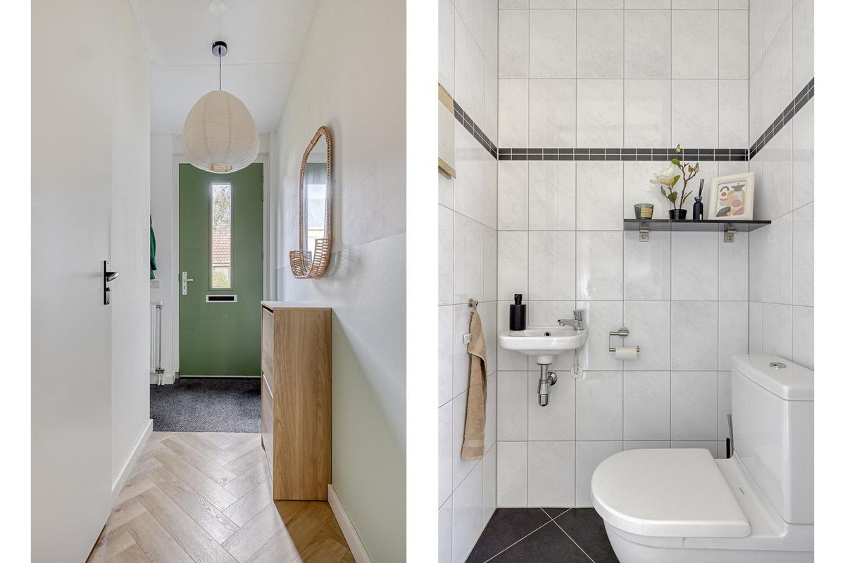 Entree/hal met meterkast, toiletruimte, trapopgang en toegang naar de woonkamer met open keuken. De toiletruimte is netjes ingericht met complete betegeling, toilet en fontein. De woonkamer heeft veel lichtinval door nagenoeg gevelbrede raampartijen, tuingerichte openslaande deuren en directe verbinding met de open keuken. De verzorgde keuken in L-vormige opstelling is voorzien van koelkast met vriesvak, combi-oven, 4-pits inductiekookplaat, afzuigkap, vaatwasser, spoelbak en diverse bergkasten en lades. De begane grondvloer is voorzien van een mooie visgraat PVC vloer met daaronder comfortabele vloerverwarming.