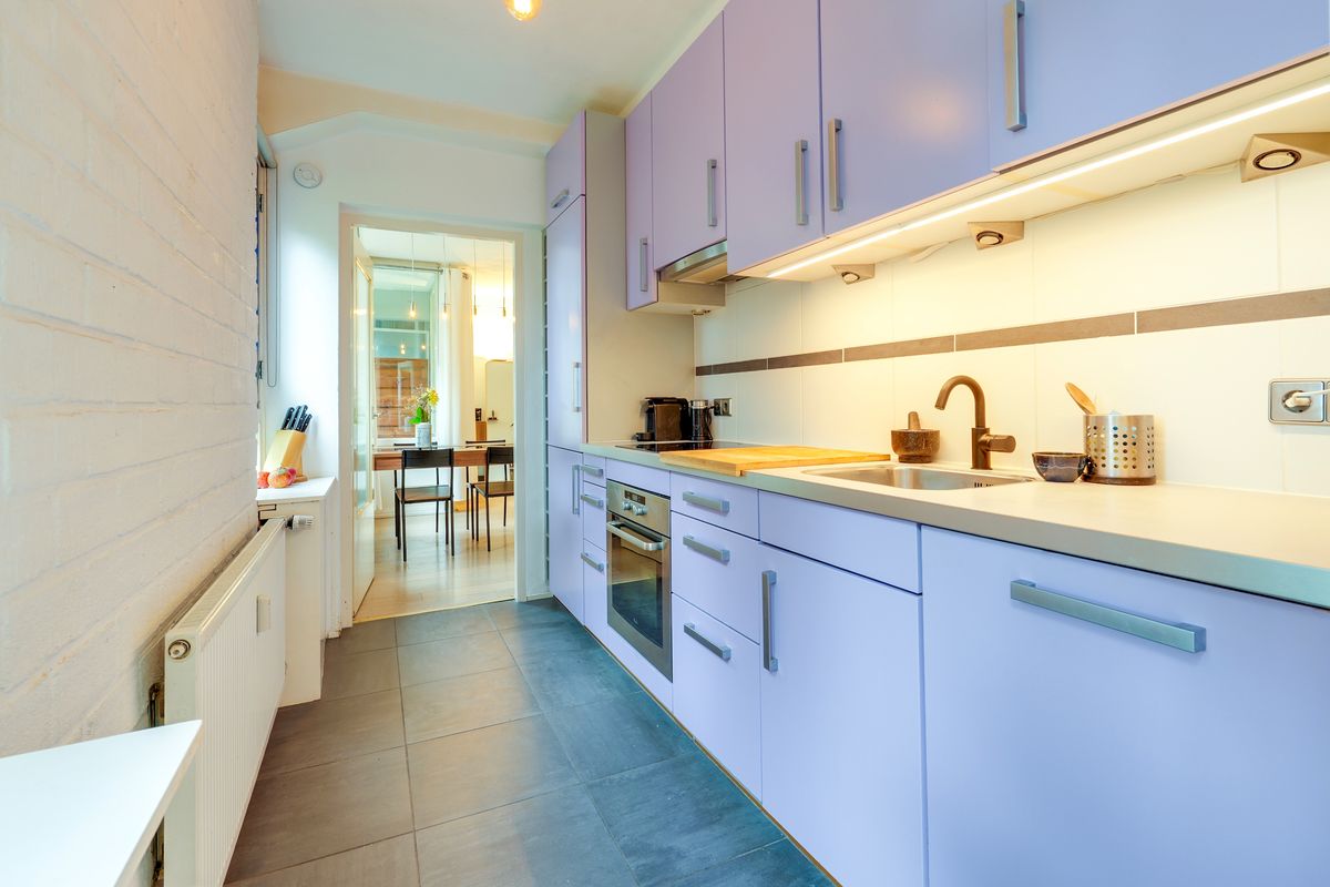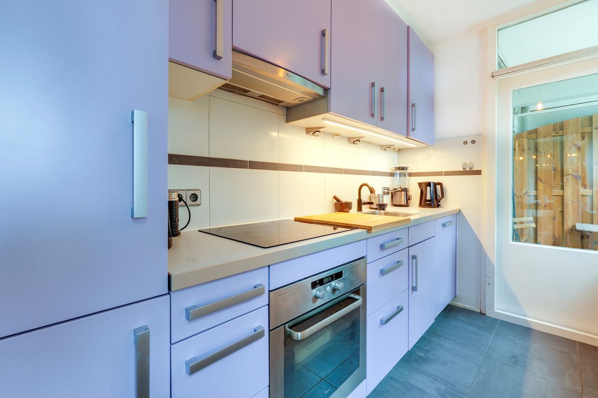 De halfopen keuken bevindt zich aan de achterzijde van de woning en is keurig onderhouden. De keuken is uitgerust met diverse inbouwapparatuur, waaronder een inductiekookplaat, afzuigkap, koel-vriescombinatie, combi-oven en een luxe mengkraan. Vanuit de keuken is er toegang tot het tweede balkon, eveneens op het zuidwesten gelegen.