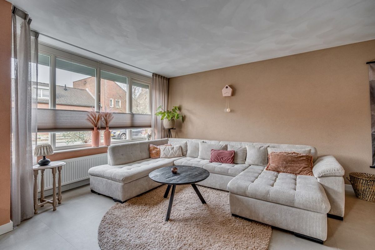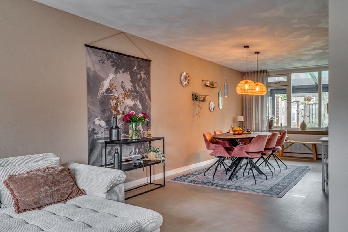 De sfeervolle L-vormige living met erker aan de voorzijde is afgewerkt met een lichte pvc-vloer die drempelloos is doorgelegd over de gehele begane grond. Dankzij de grote raampartijen aan zowel de voor- als achterzijde en de openslaande tuindeur vanuit de keuken geniet de woonkamer van een prettige, natuurlijke lichtinval en is er aan beide zijden optimaal contact met de tuin.