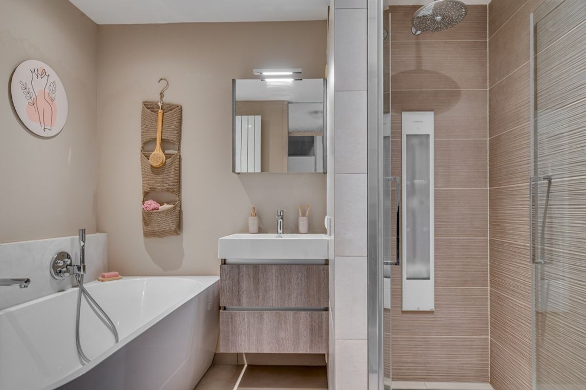 • Vernieuwde badkamer (2022) met inloopdouche, ligbad, toilet en wastafelmeubel, inclusief vloerverwarming en ingebouwd muzieksysteem