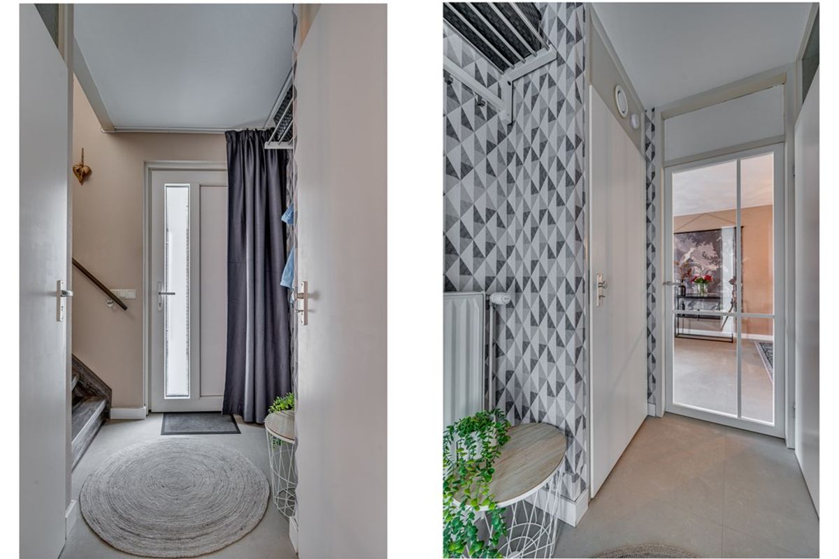 Via de overkapte zijkant van de woning betreedt u de verzorgde hal, afgewerkt met een fraaie pvc-vloer. In de hal bevinden zich de opgang naar de eerste verdieping, een praktische garderobe, de meterkast en het in 2022 vernieuwde, moderne toilet met fonteintje. Vanuit hier heeft u tevens toegang tot de ruime en sfeervolle living.