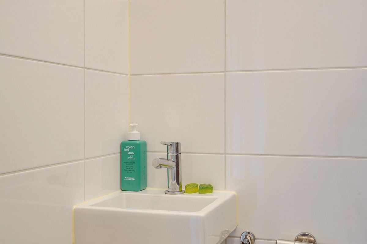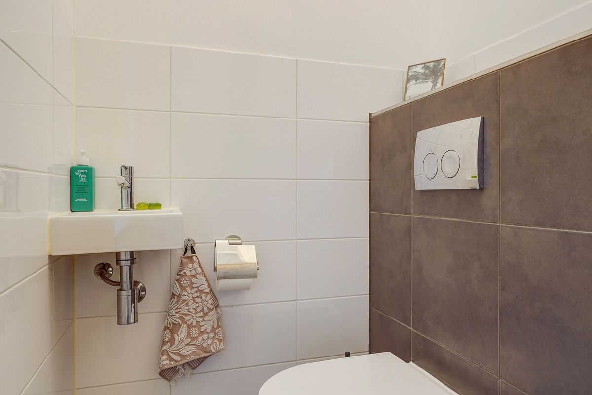 Na binnenkomst van het appartement op de eerste verdieping, treffen we de hal. In de hal is de toiletruimte te betreden. De toiletruimte ziet er netjes en modern uit en heeft een hangend toilet met inbouw reservoir en fontein met wasbak.