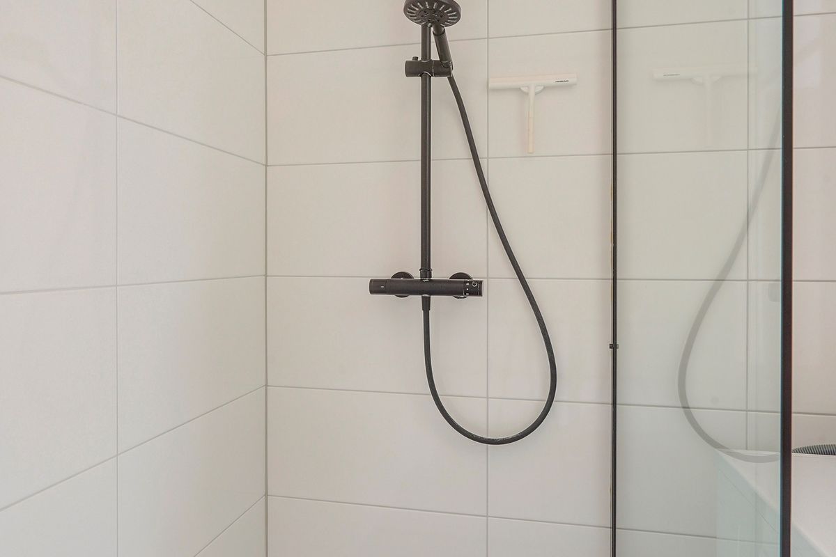 Vanuit de slaapkamer is er toegang tot de badkamer. De badkamer is in 2018 geïnstalleerd en voorzien van een inloopdouche, wasbak met meubel en handdoekradiator. De kranen e.d. zijn in zwart uitgevoerd en het oogt netjes en modern. Ook is in de badkamer de wasmachine geplaatst.