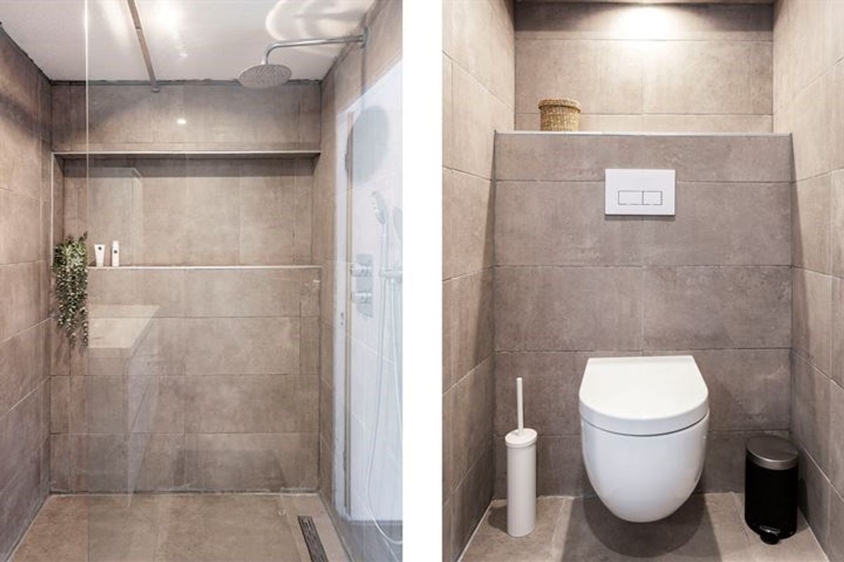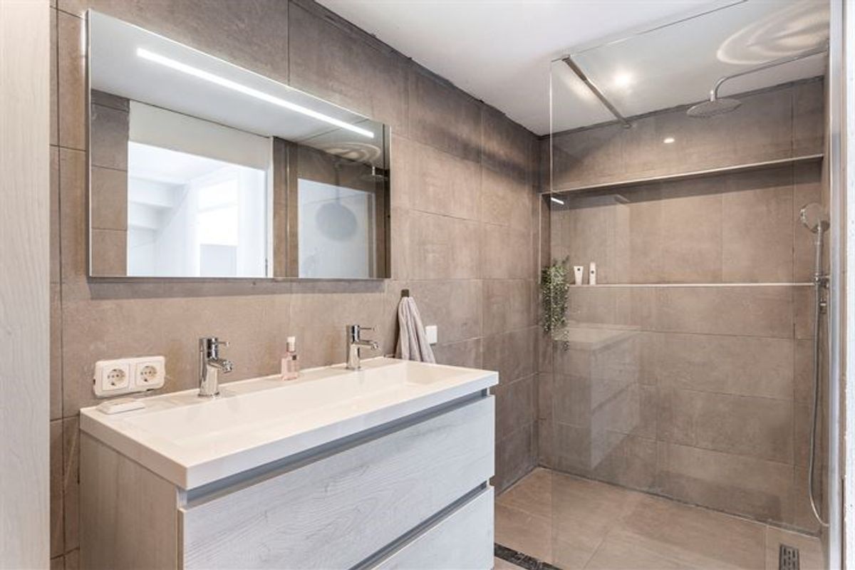 Ruime overloop, 3 slaapkamers en een ruime badkamer met inloopdouche, toilet en een dubbel wastafelmeubel.