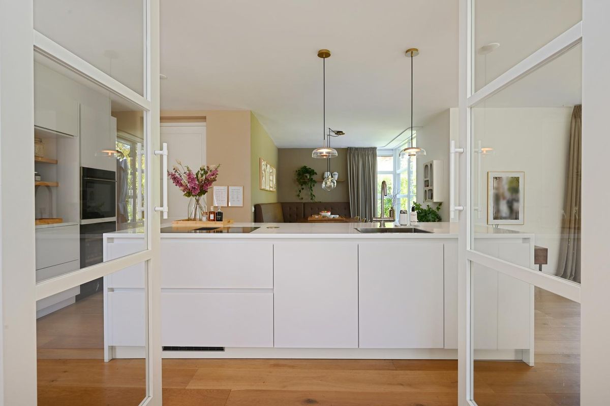 Het middelpunt van de woning is de prachtige keuken met royaal kookeiland, veel kastruimte, ontbijtbar en een strakke kastenwand. De keuken is luxe uitgerust met een inductiekookplaat met geïntegreerde afzuiging, vaatwasser, Quooker (plat, bruisend en gefilterd water), oven, wijnklimaatkast en koel-/vriescombinatie. De eetkamer grenst direct aan de keuken en biedt een knusse setting met uitzicht op de achtertuin.