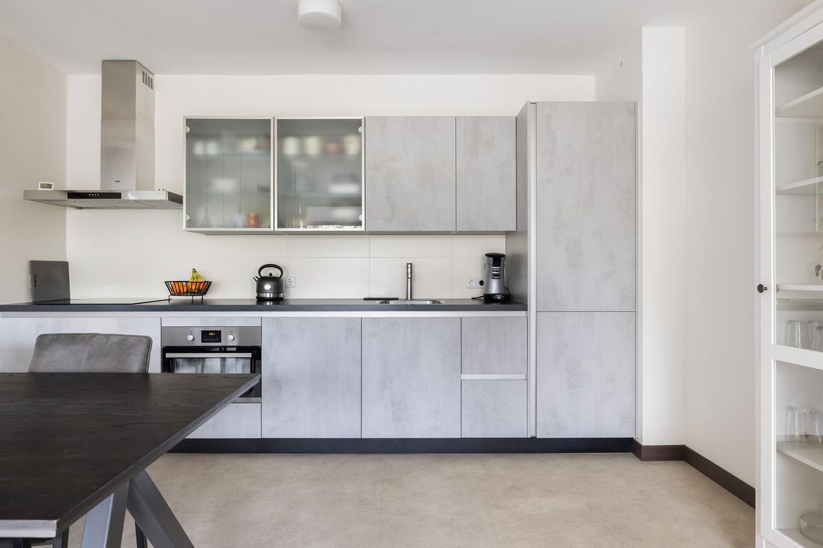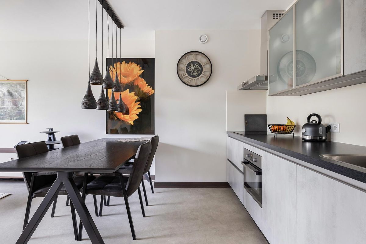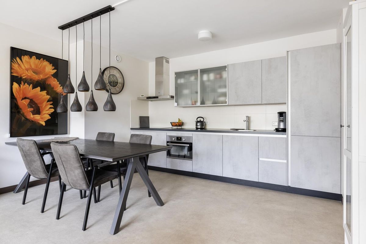 De open keuken is modern ingericht en voorzien van inbouwapparatuur zoals een koelkast, vriezer, combimagnetron, inductiekookplaat met afzuigkap en een vaatwasser.