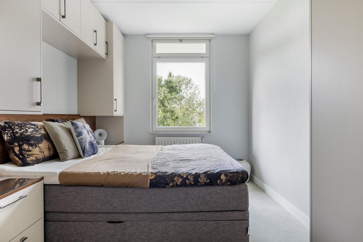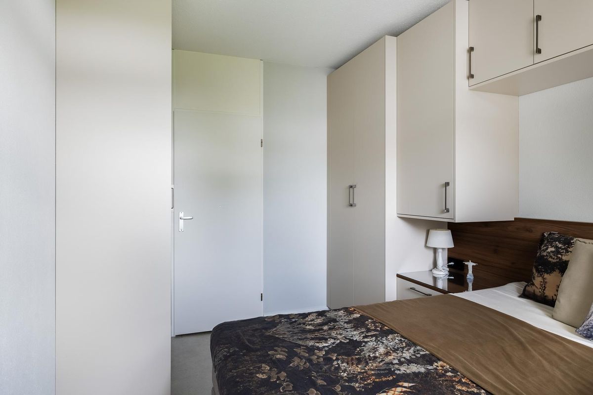 De slaapkamer aan de achterzijde biedt plaats aan een tweepersoonsbed en beschikt over praktische kastruimte.