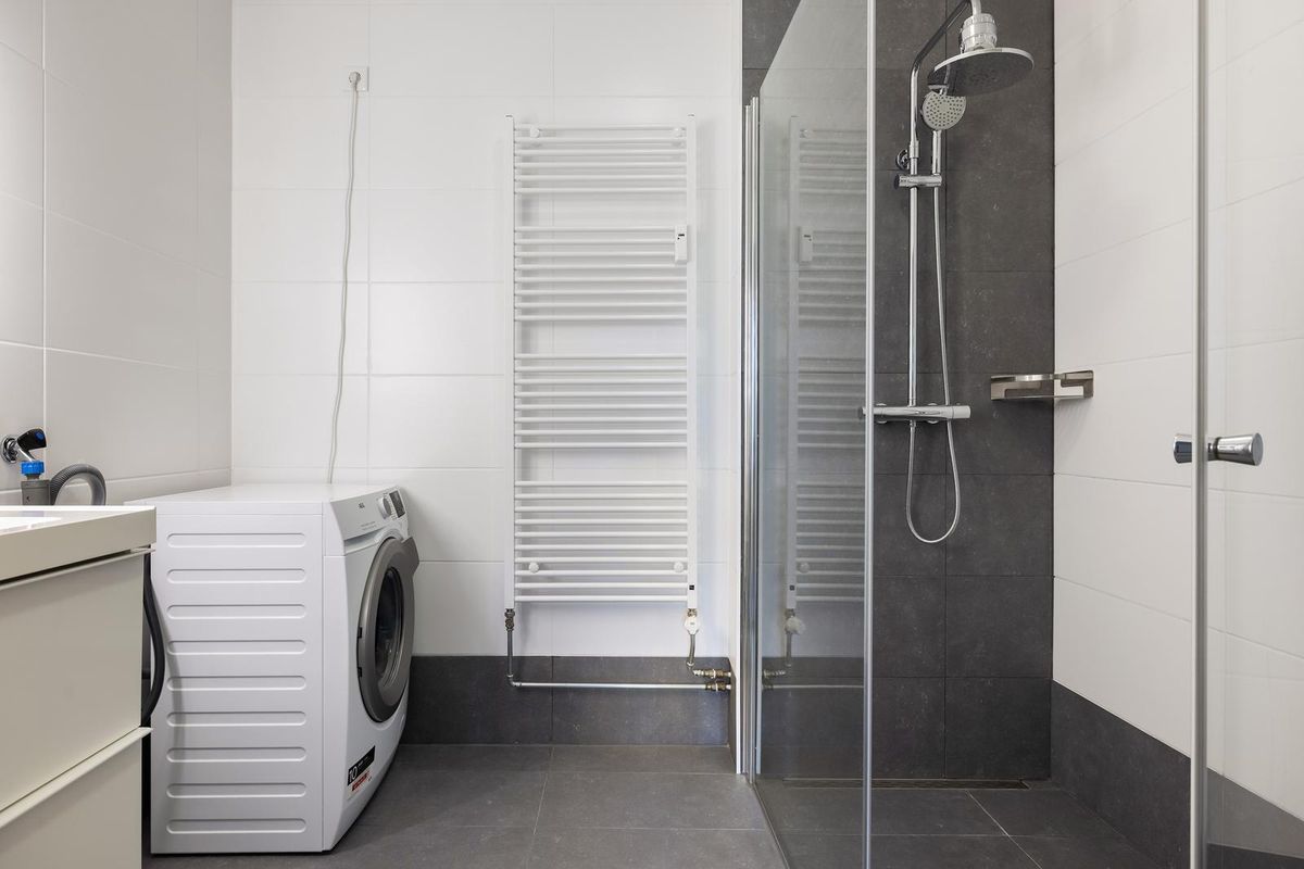De badkamer is modern afgewerkt met een inloopdouche, wastafelmeubel en aansluiting voor de wasmachine.