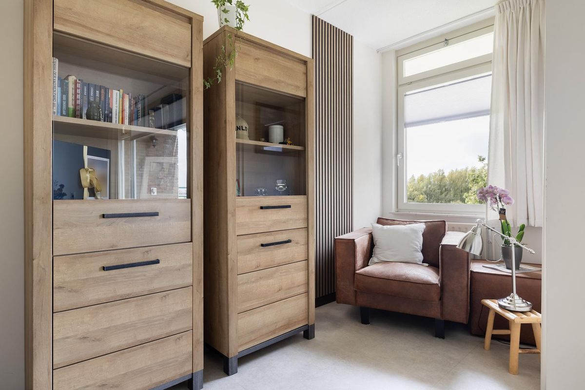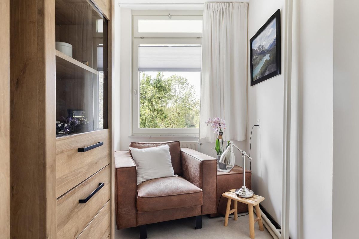 De woonkamer is heerlijk licht door de grote raampartijen en heeft een open verbinding met de voormalige slaapkamer, nu ingericht als leeshoek of werkkamer. Desgewenst kan hier eenvoudig weer een extra slaapkamer worden gecreëerd. Vanuit de woonkamer stap je direct het terras op, met een fraai uitzicht over het groen en Het Wantij.