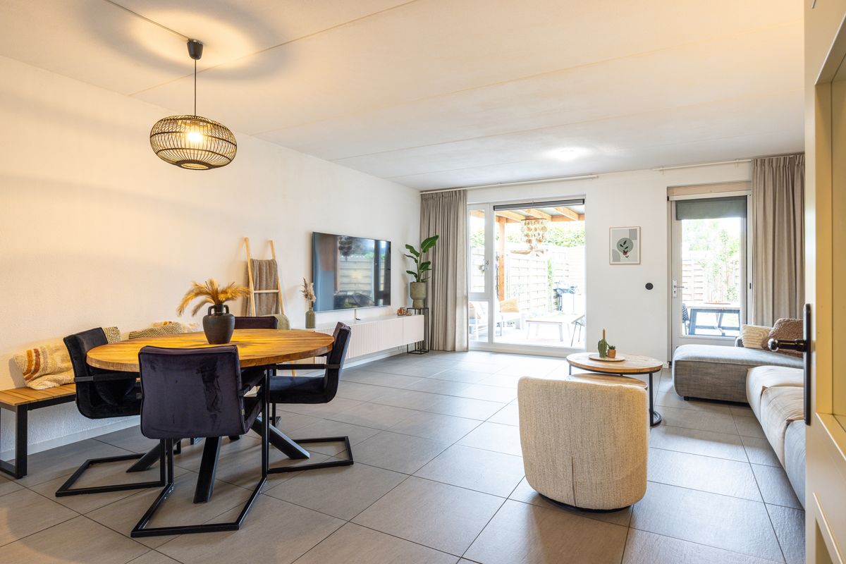 De woonkamer heeft een prettige, open indeling en oogt licht en uitnodigend door de natuurlijke lichtinval aan de voor- en achterzijde. De ruimte biedt voldoende plaats voor zowel een gezellige zithoek als een ruime eethoek. De tegelvloer met vloerverwarming zorgt niet alleen voor comfort in de winter, maar geeft de kamer ook een strakke en onderhoudsvriendelijke uitstraling. Via de woonkamer loop je zo de achtertuin in, waardoor binnen en buiten prettig in elkaar overlopen.