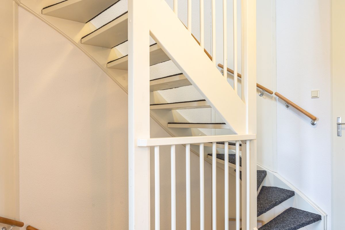 De trap in de hal leidt naar de eerste verdieping, waar de overloop is afgewerkt met tapijt en toegang biedt tot drie slaapkamers en de badkamer.