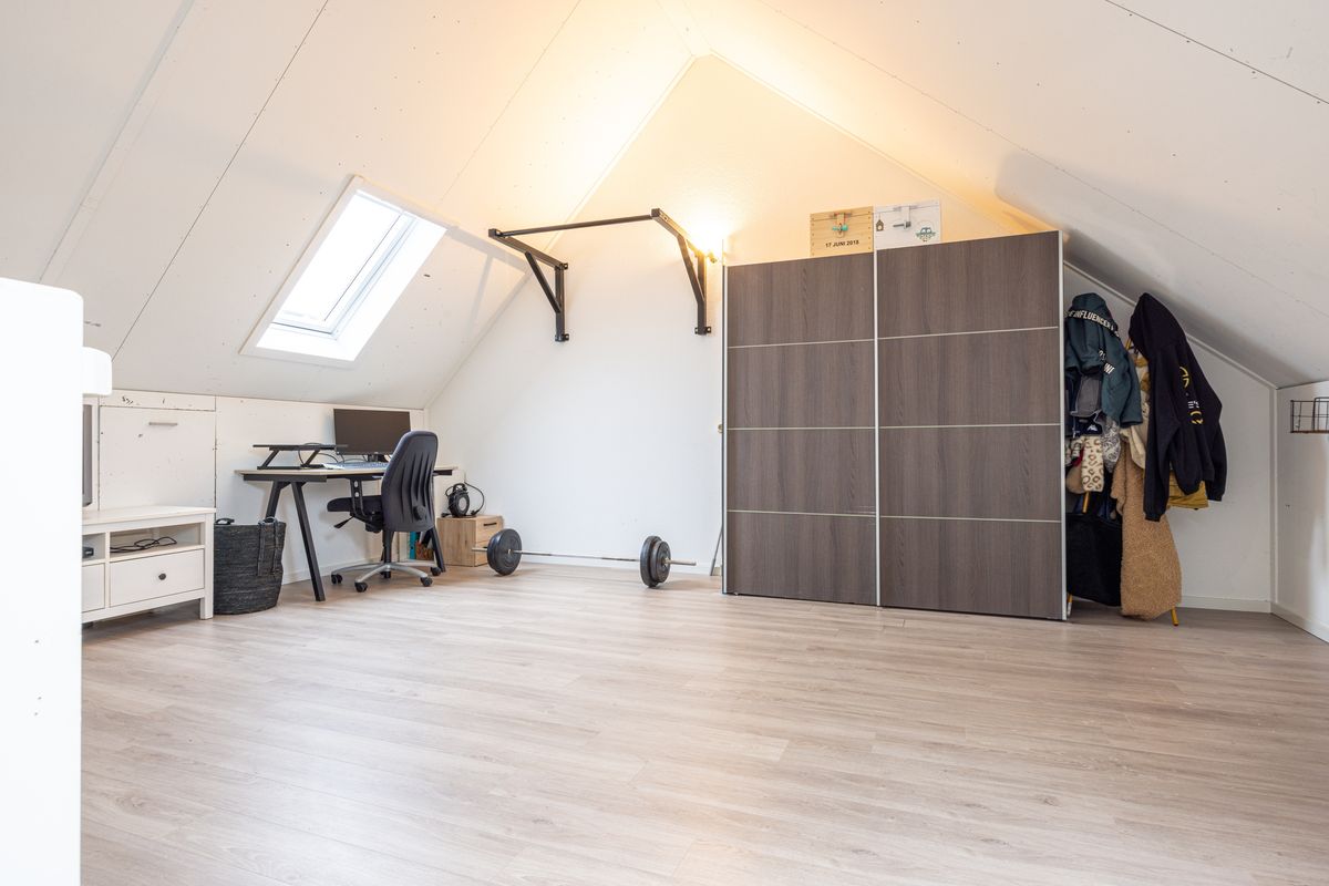 Via een vaste trap kom je op de tweede verdieping, die verrassend veel ruimte biedt. Hier bevindt zich een ruime verdieping waar eventueel een vierde slaapkamer of werkkamer gecreëerd kan worden. De verdieping is afgewerkt met laminaat en voorzien van twee dakramen die voor een prettige hoeveelheid daglicht zorgen. Achter de knieschotten is handige bergruimte gecreëerd.