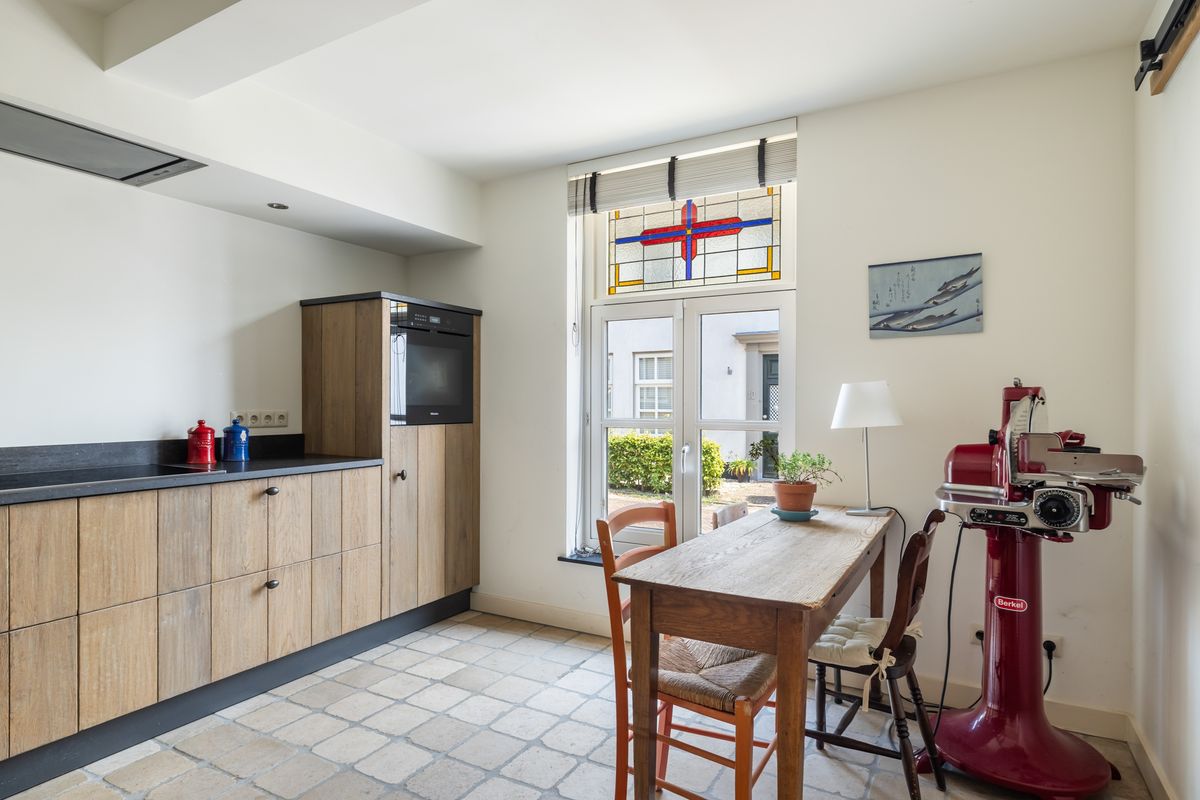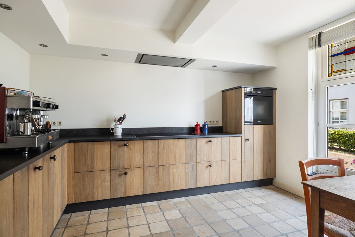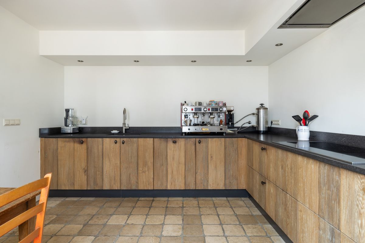 De royale in hoek opgestelde keuken uitgevoerd in massief hout met composiet aanrechtblad uitgerust met een 5-pits inductie kookplaat, RVS afzuigkap, combioven, kokend waterkraan en comfortabele vaatwasser. De raampartij aan de voorzijde geeft u prettig licht in de keuken.