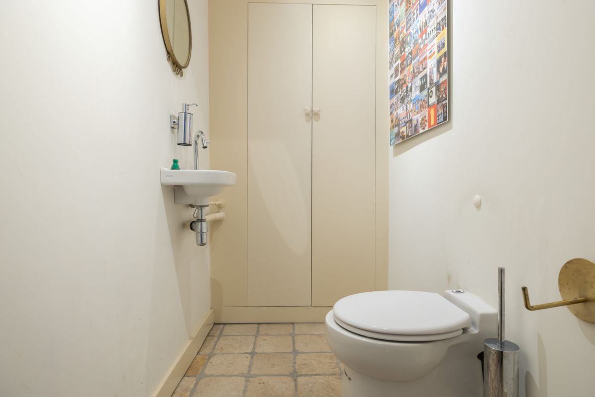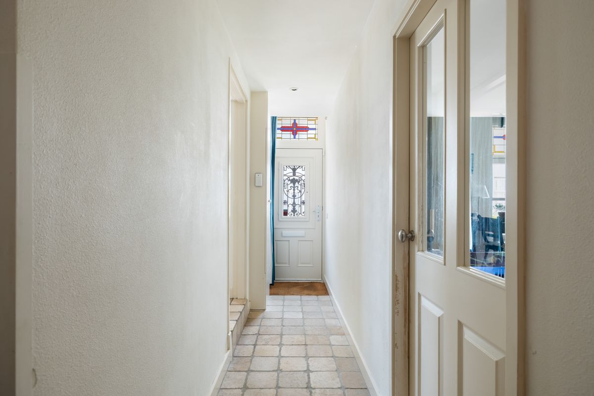 Centrale hal met meterkast, toiletruimte met staand closet, fonteintje en vaste inbouwkast met cv installatie, toegang tot het souterrain en trapopgang naar de 1e verdieping.