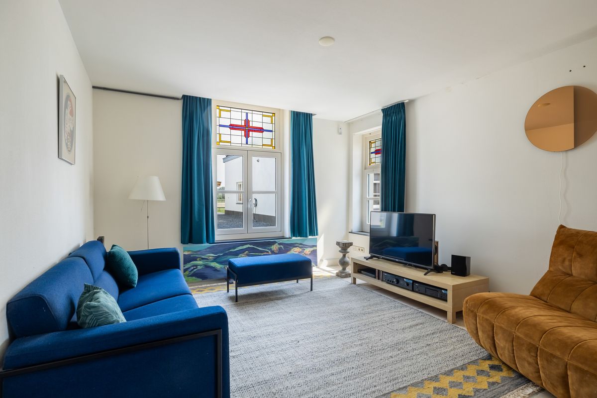 Via de gang betreedt u de woonkamer. De grote ramen met glas in lood bovenlichten geven zicht op de Havendijk en zorgen voor voldoende lichtinval.