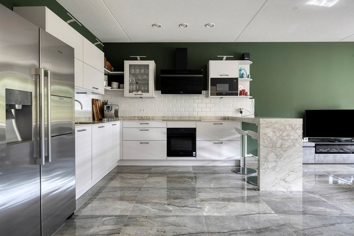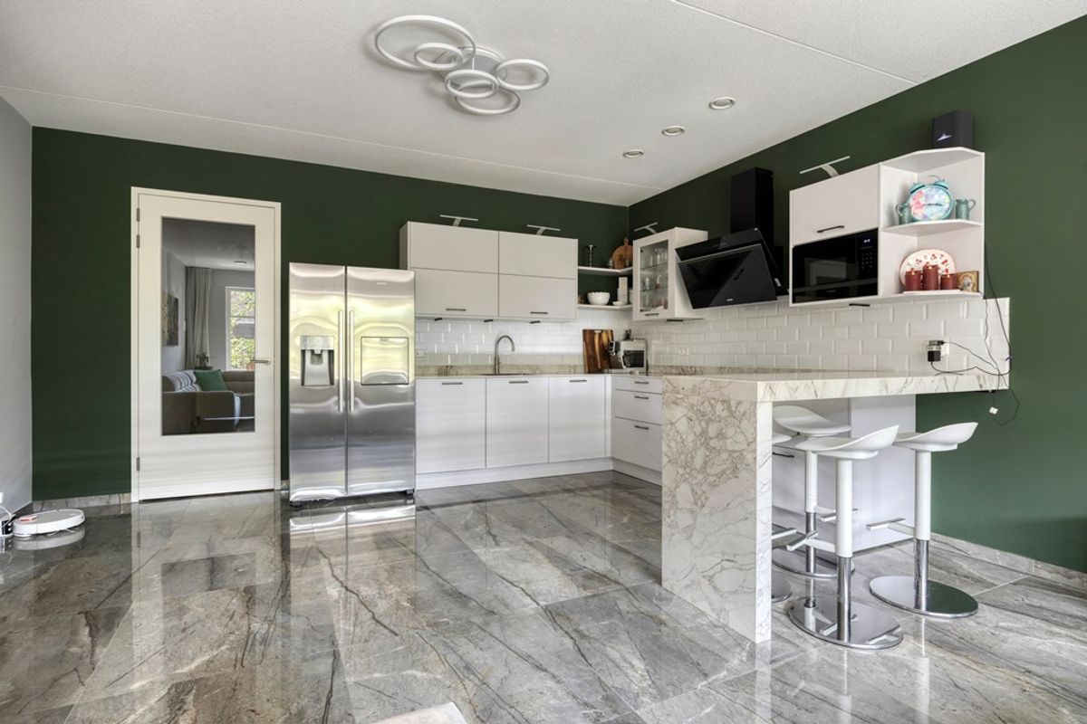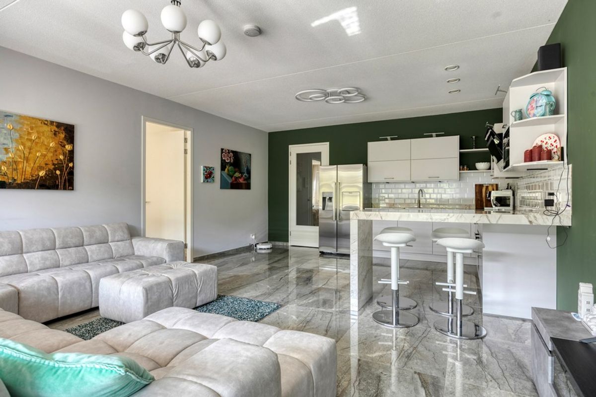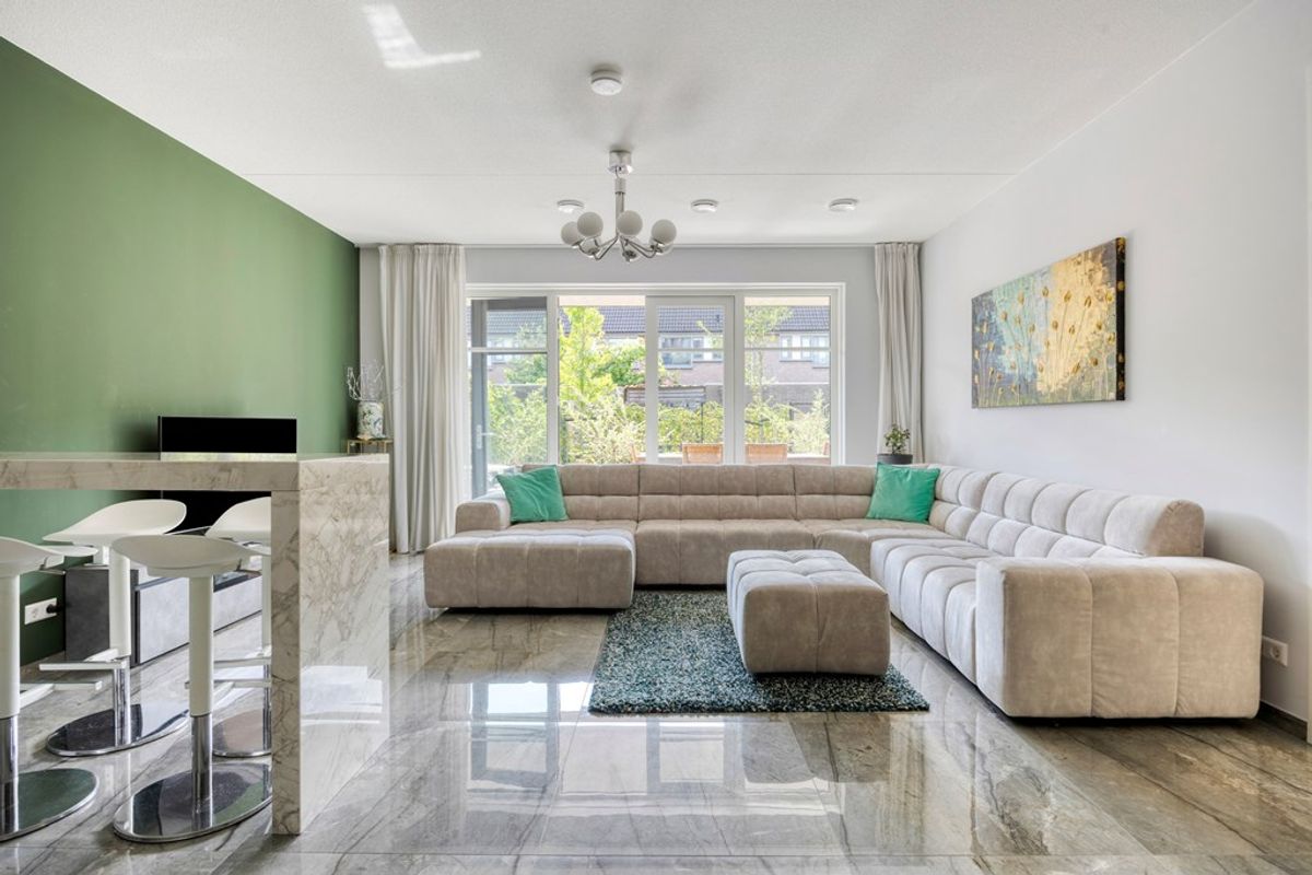 De lichte en ruime woonkamer met open keuken bevindt zich aan de achterzijde van de woning. Deze geeft toegang tot de ruime tuin (ca. 104m2) met terras, gelegen op het zuidwesten. De open keuken is compleet uitgerust en luxe afgewerkt.