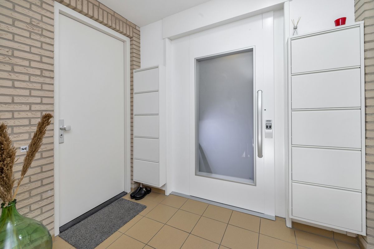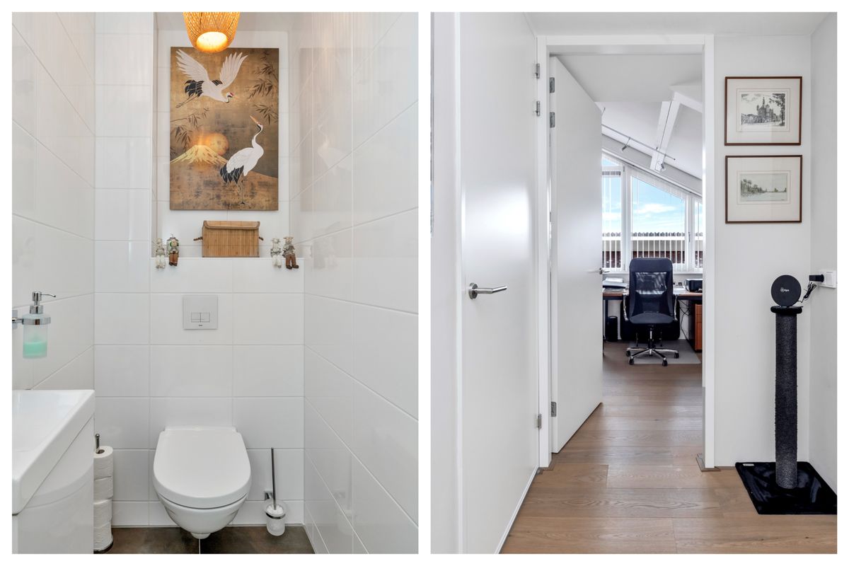 Met de trap of lift bereikt u de tweede verdieping. Vanuit de hal heeft u toegang tot de meterkast (met glasvezelaansluiting), garderoberuimte en een modern afgewerkte toiletruimte met zwevend toilet en fonteinmeubel.