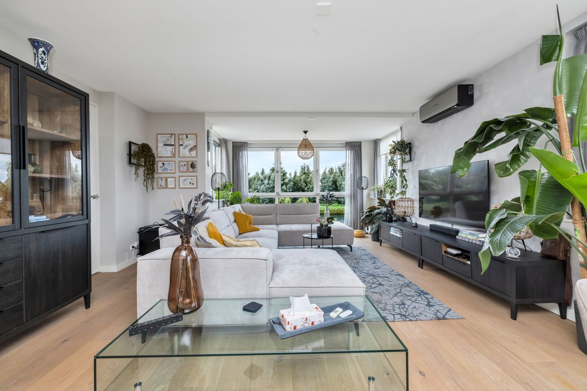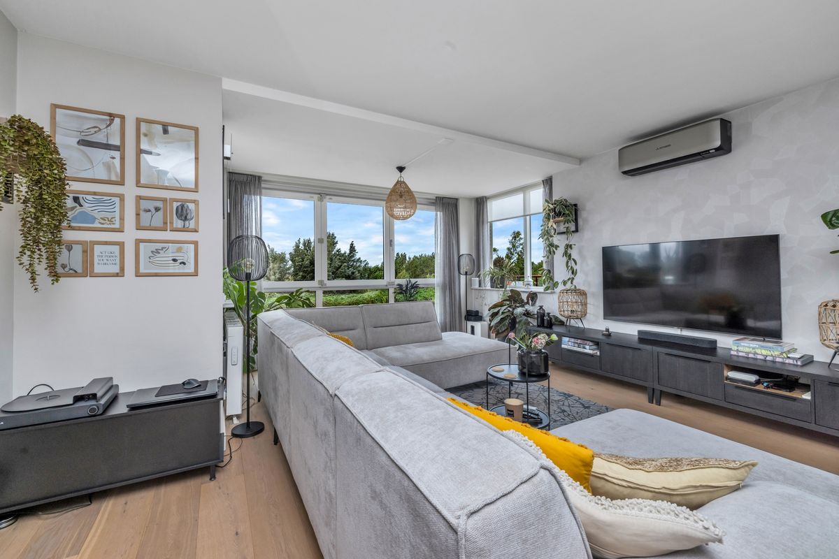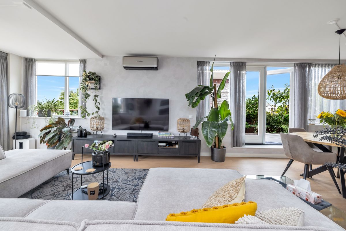 De royale woonkamer is een lichte, uitnodigende ruimte met grote raampartijen en prachtig uitzicht. De vloer is voorzien van een stijlvolle lamelparketvloer en de wanden en plafonds zijn strak afgewerkt de woonkamer is voorzien van air-conditioning. Openslaande deuren geven toegang tot het ruime dakterras – de perfecte plek om te genieten van het buitenleven.