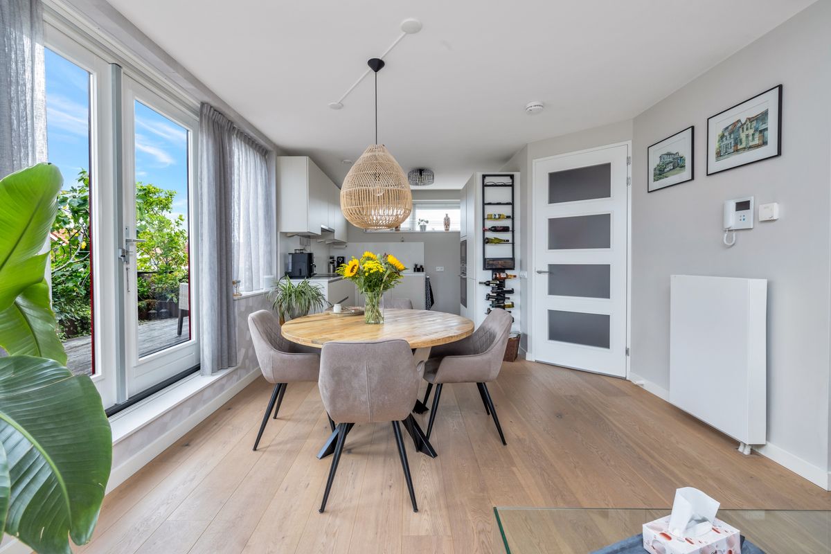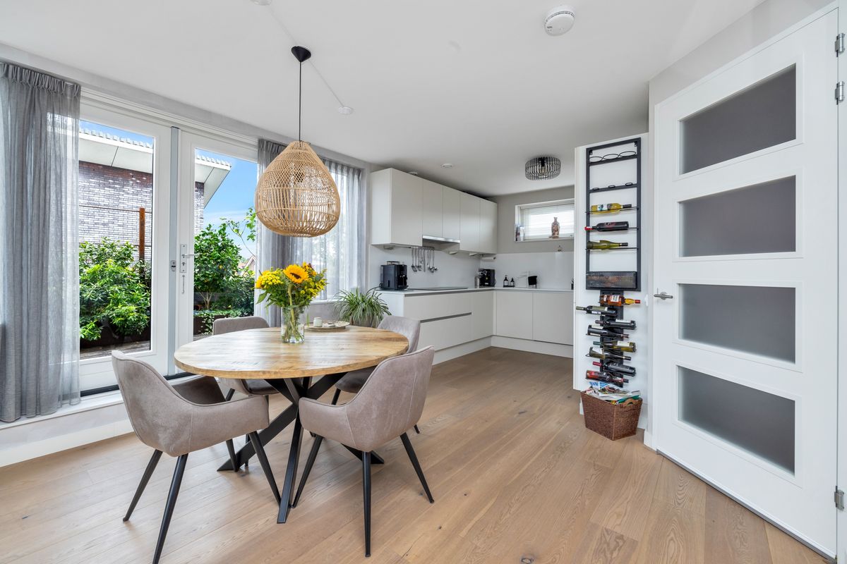 Dankzij de hoge ramen is de keuken heerlijk licht. Vanuit de keuken bereikt u de praktische bijkeuken met opstelling van de Intergas c.v.-combiketel (2017), de mechanische ventilatie-unit en aansluitingen voor wasmachine en droger.