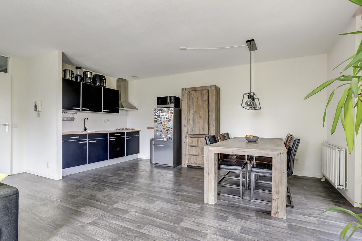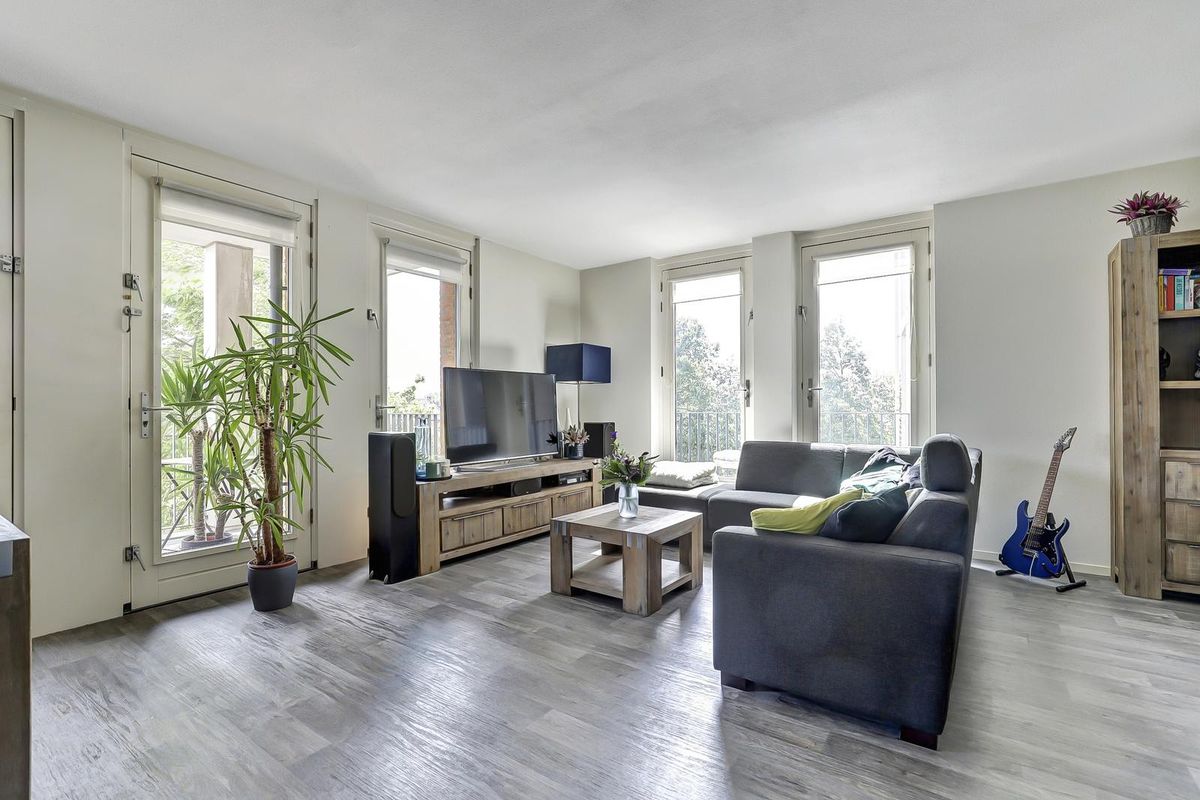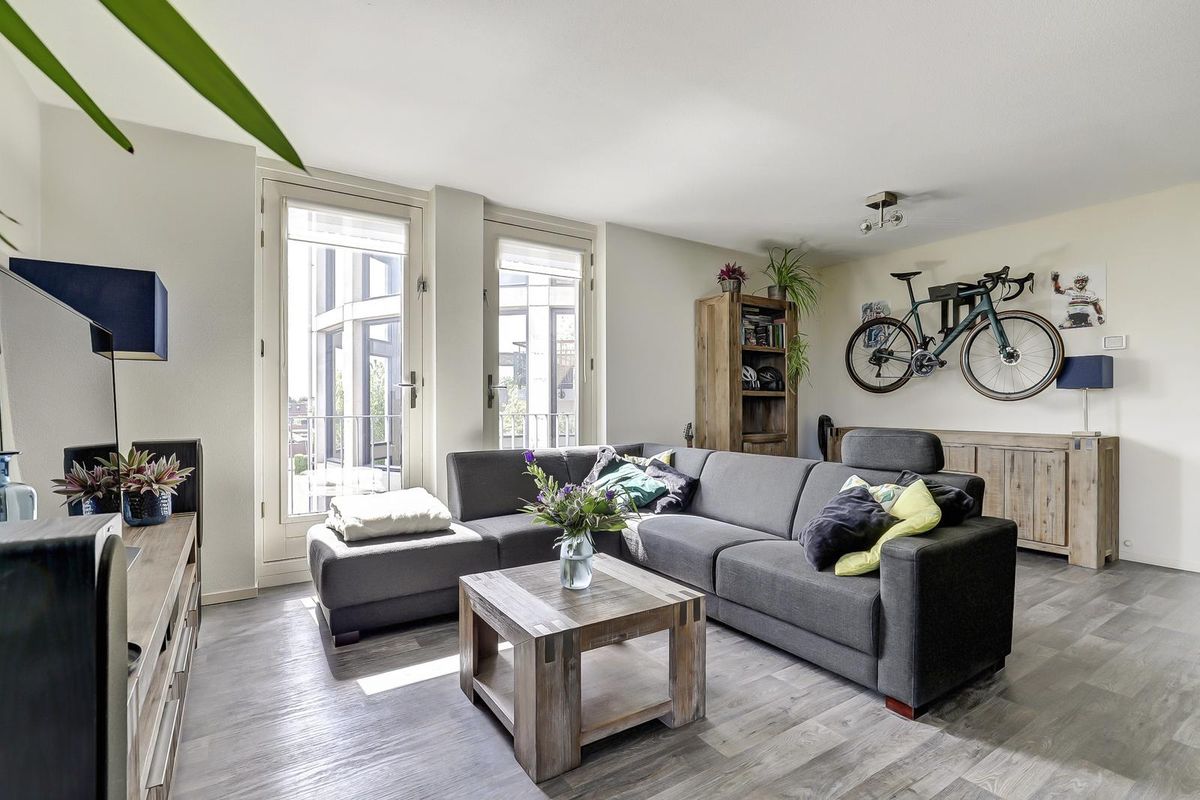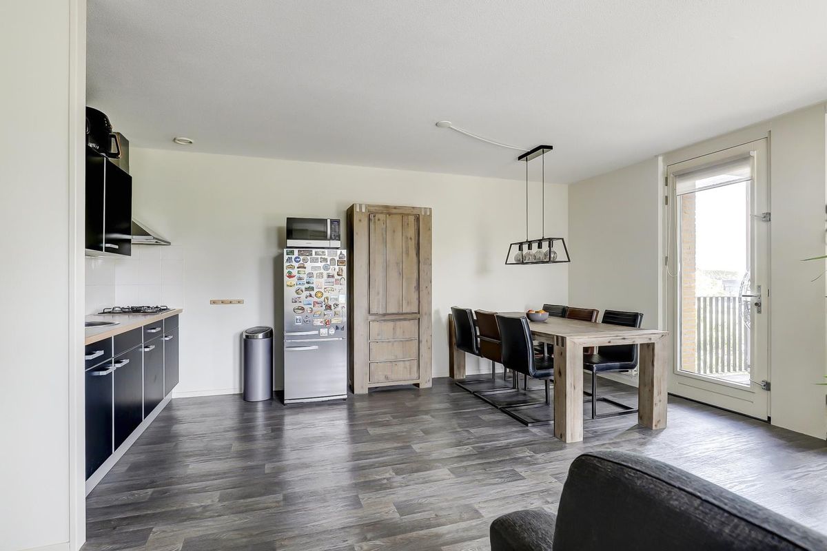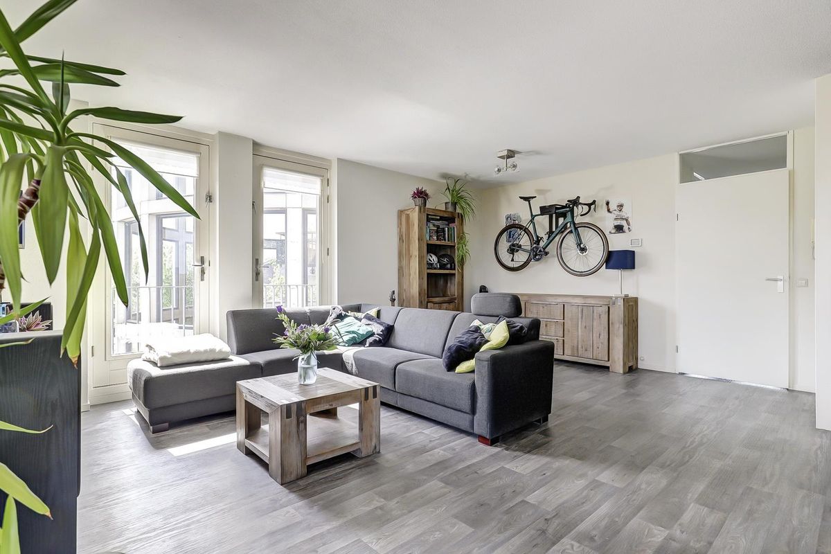 Als laatste bereik je vanuit de hal, de woonkamer met open keuken. Dankzij de vele raampartijen geniet je hier van een zee aan natuurlijk licht. De twee Franse balkondeuren aan de westkant zorgen voor een extra open en ruimtelijk gevoel. Het zonnige balkon aan de achterzijde bereik je via maar liefst drie deuren, wat betekent dat iedere opstelling op het balkon mogelijk is en je optimaal kunt genieten van het buiten zijn. De open keuken is praktisch ingedeeld en voorzien van een gaskookplaat, een afzuigkap en bergruimte.