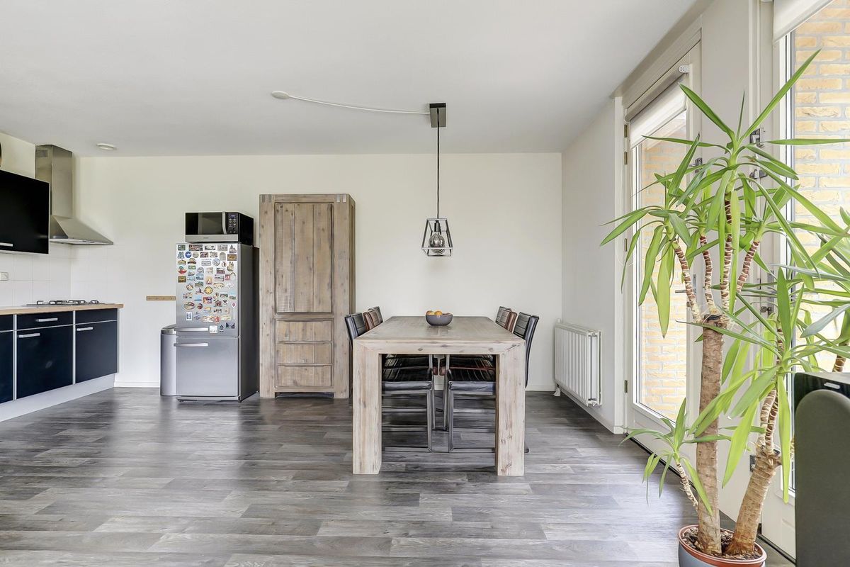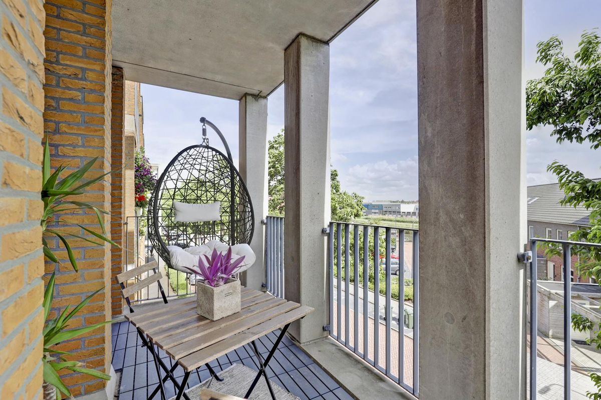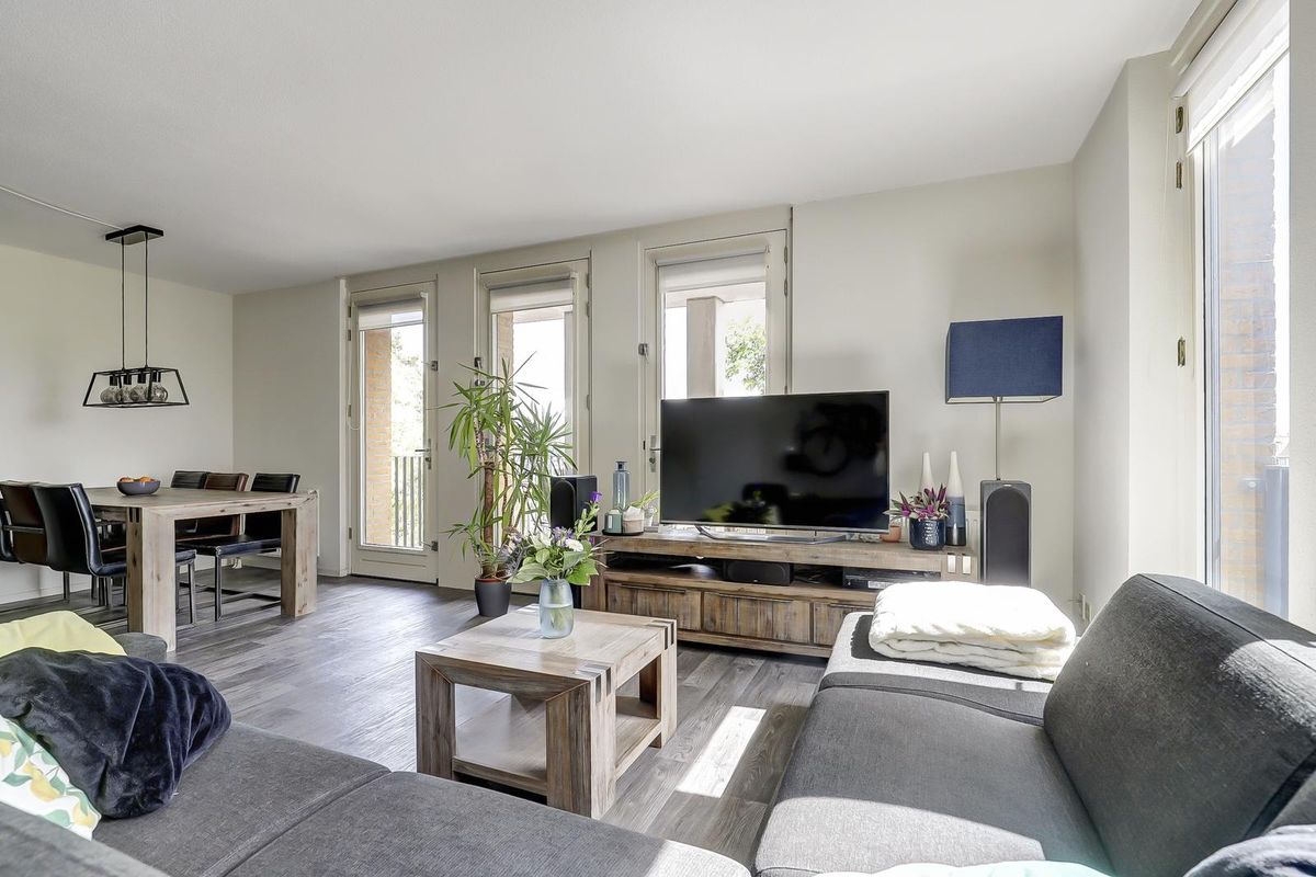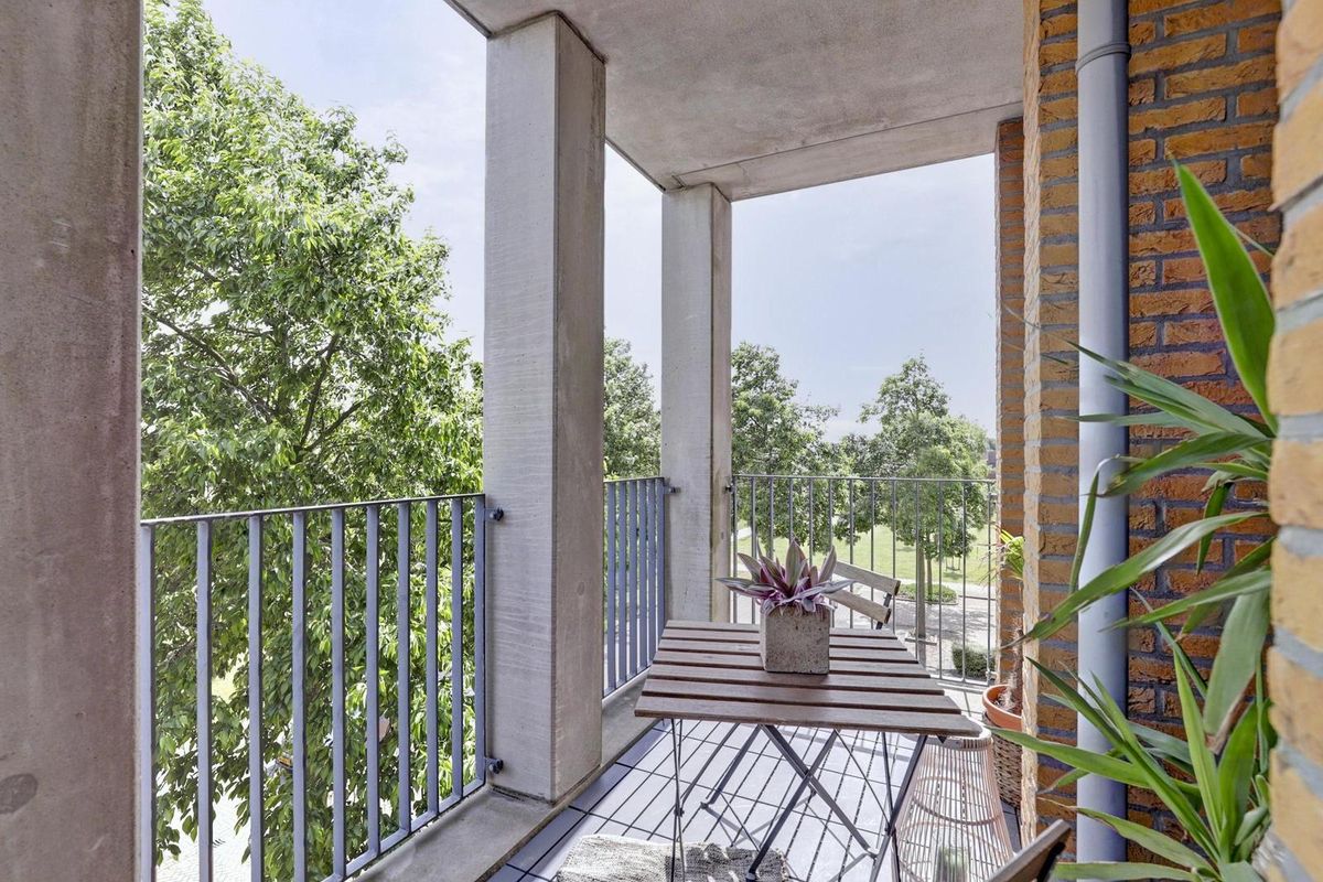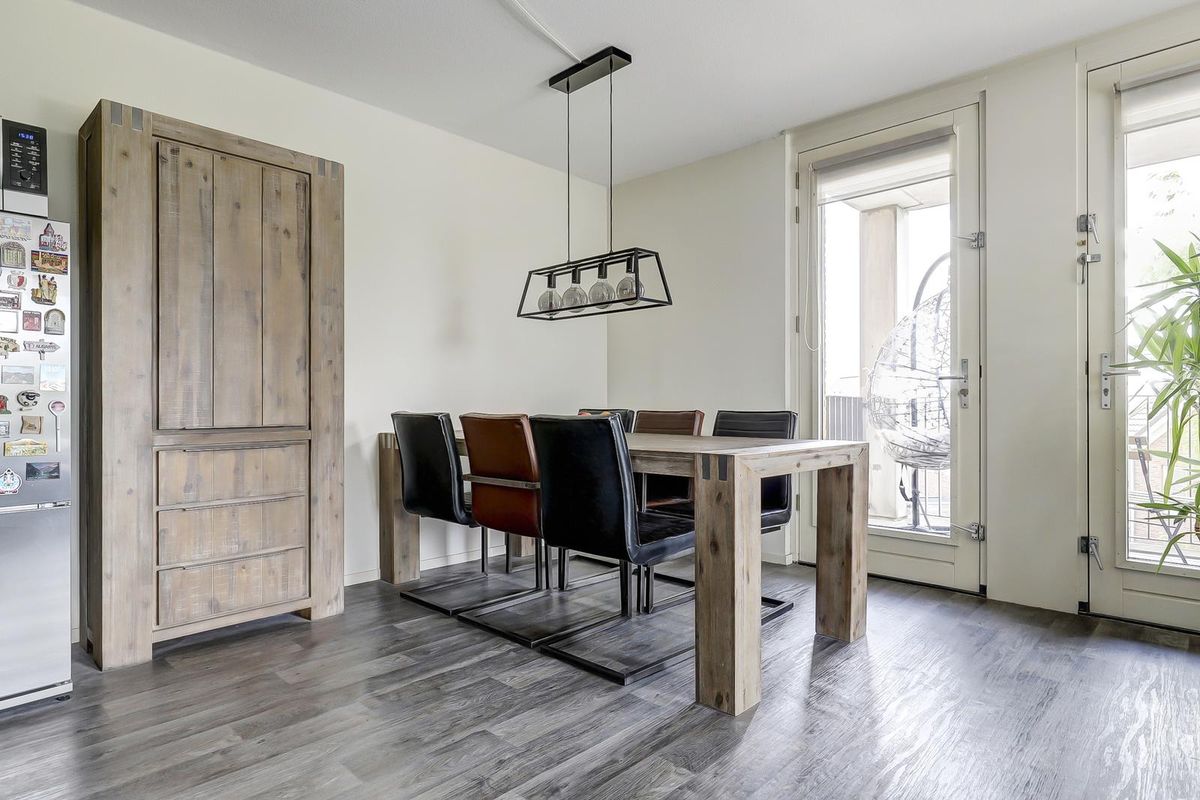 Als laatste bereik je vanuit de hal, de woonkamer met open keuken. Dankzij de vele raampartijen geniet je hier van een zee aan natuurlijk licht. De twee Franse balkondeuren aan de westkant zorgen voor een extra open en ruimtelijk gevoel. Het zonnige balkon aan de achterzijde bereik je via maar liefst drie deuren, wat betekent dat iedere opstelling op het balkon mogelijk is en je optimaal kunt genieten van het buiten zijn. De open keuken is praktisch ingedeeld en voorzien van een gaskookplaat, een afzuigkap en bergruimte.