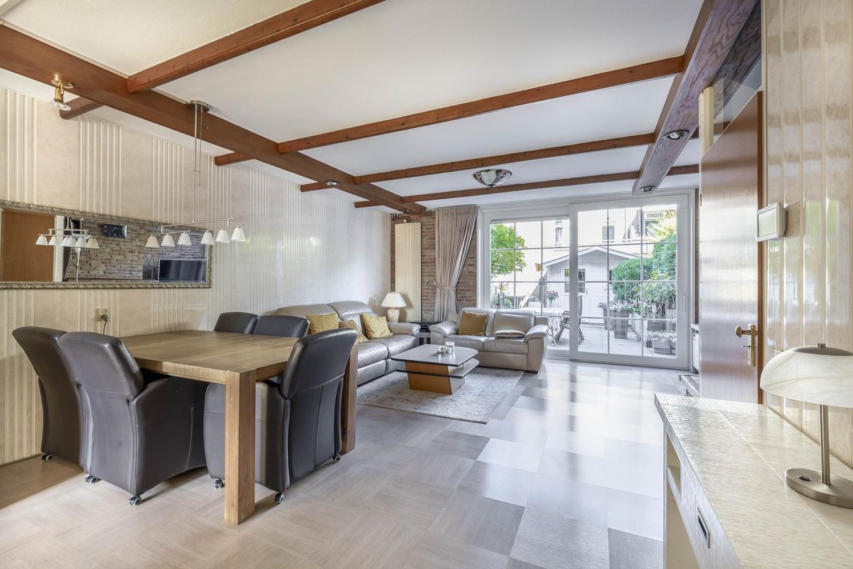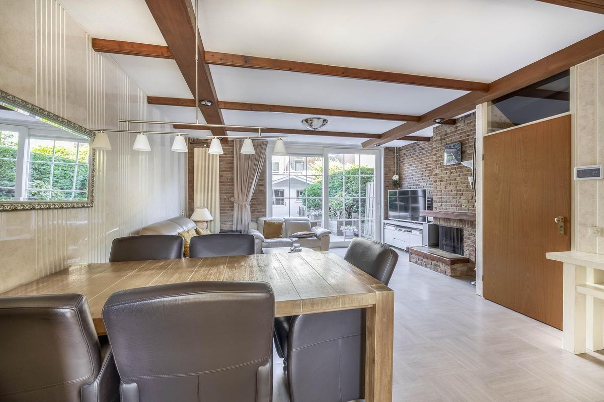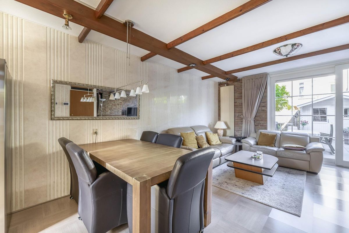 Het leefgedeelte is ruim opgezet, waardoor er voldoende plek is voor een comfortabele zithoek én een royale eethoek. Dankzij de grote schuifpui valt er volop natuurlijk licht binnen, wat de ruimte extra licht en sfeervol maakt. In het plafond zijn houten balken verwerkt, waarin subtiele lichtspotjes zijn geïntegreerd. Daarnaast zorgt een sfeervolle openhaard in het woongedeelte voor extra warmte en gezelligheid. Met de schuifpui loopt de woonkamer naadloos over in de royale achtertuin, wat zorgt voor een prettige combinatie van binnen- en buitenleven.
