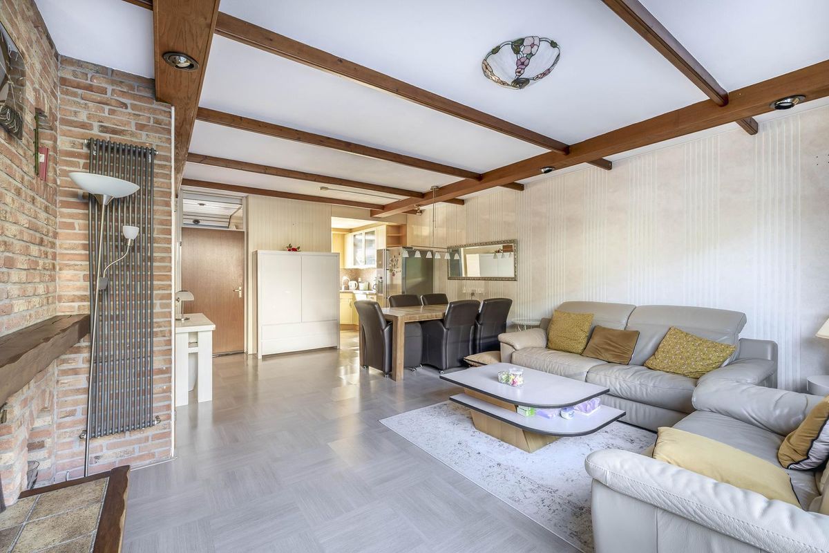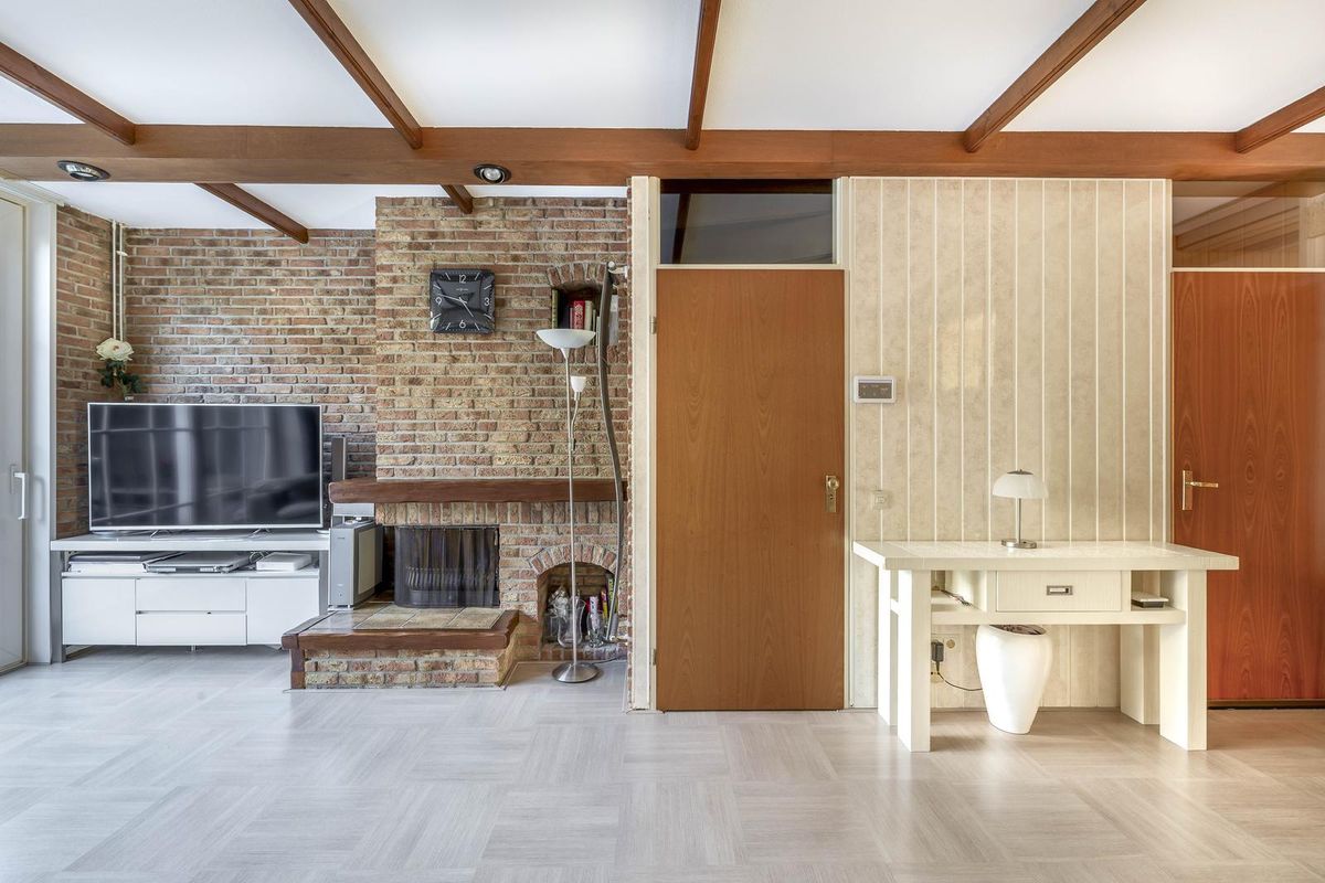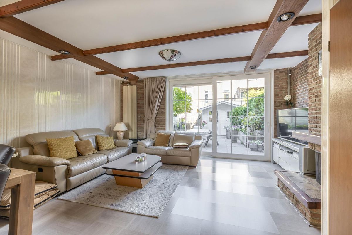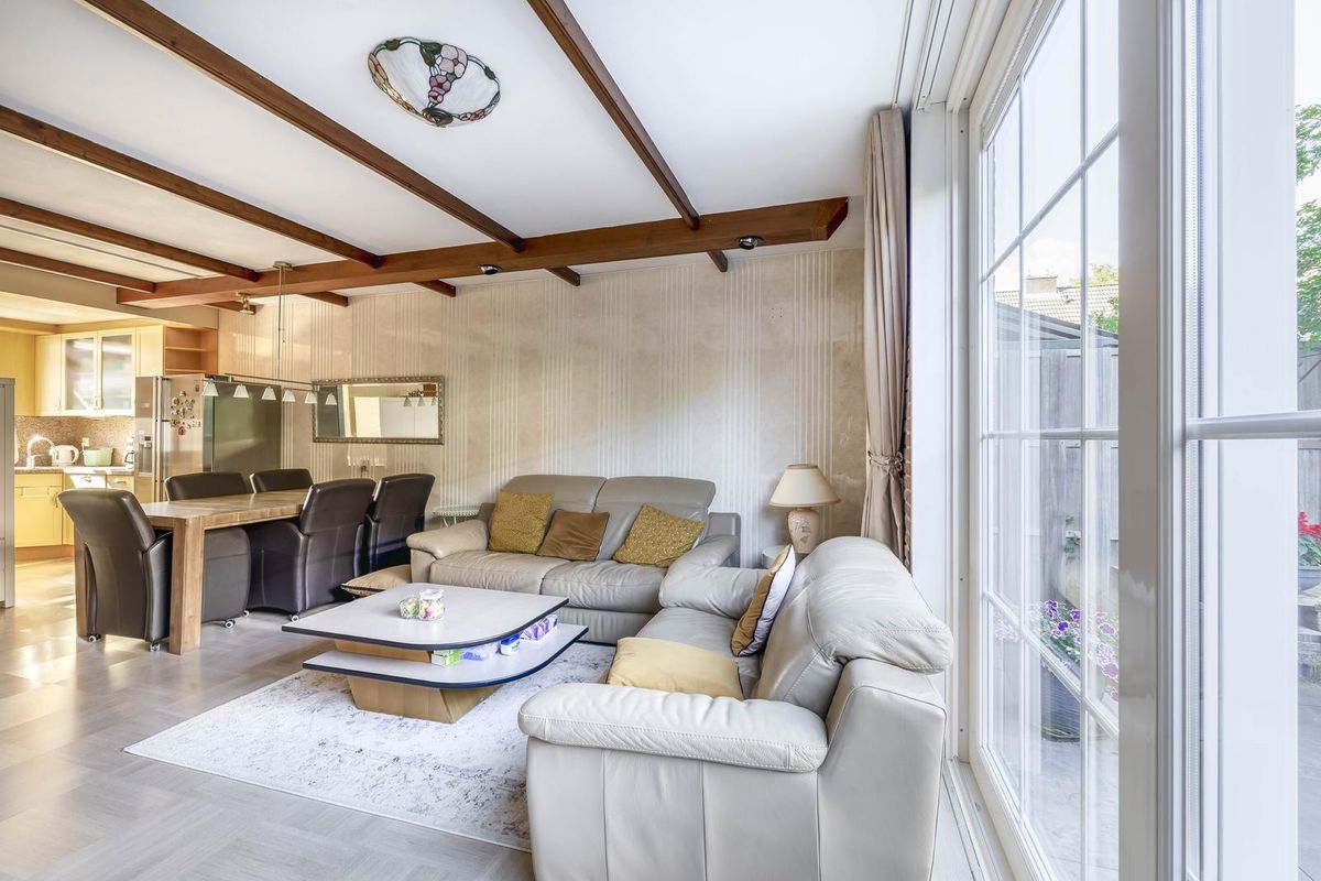 Het leefgedeelte is ruim opgezet, waardoor er voldoende plek is voor een comfortabele zithoek én een royale eethoek. Dankzij de grote schuifpui valt er volop natuurlijk licht binnen, wat de ruimte extra licht en sfeervol maakt. In het plafond zijn houten balken verwerkt, waarin subtiele lichtspotjes zijn geïntegreerd. Daarnaast zorgt een sfeervolle openhaard in het woongedeelte voor extra warmte en gezelligheid. Met de schuifpui loopt de woonkamer naadloos over in de royale achtertuin, wat zorgt voor een prettige combinatie van binnen- en buitenleven.