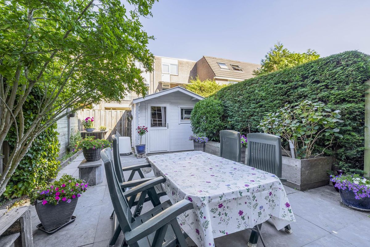 De royale achtertuin is gelegen op het westen en is onderhoudsvriendelijk aangelegd met grote tegels. Aan de zijkant is een klein stukje beplanting toegevoegd, wat zorgt voor een mooie balans tussen groen en bestrating. Achterin de tuin bevindt zich een houten berging, ideaal voor het opbergen van tuingereedschap of fietsen. Dankzij de achterom is de tuin ook gemakkelijk bereikbaar.