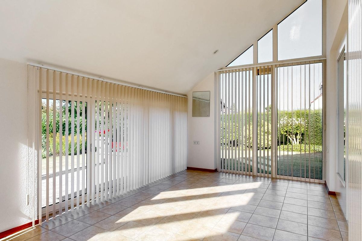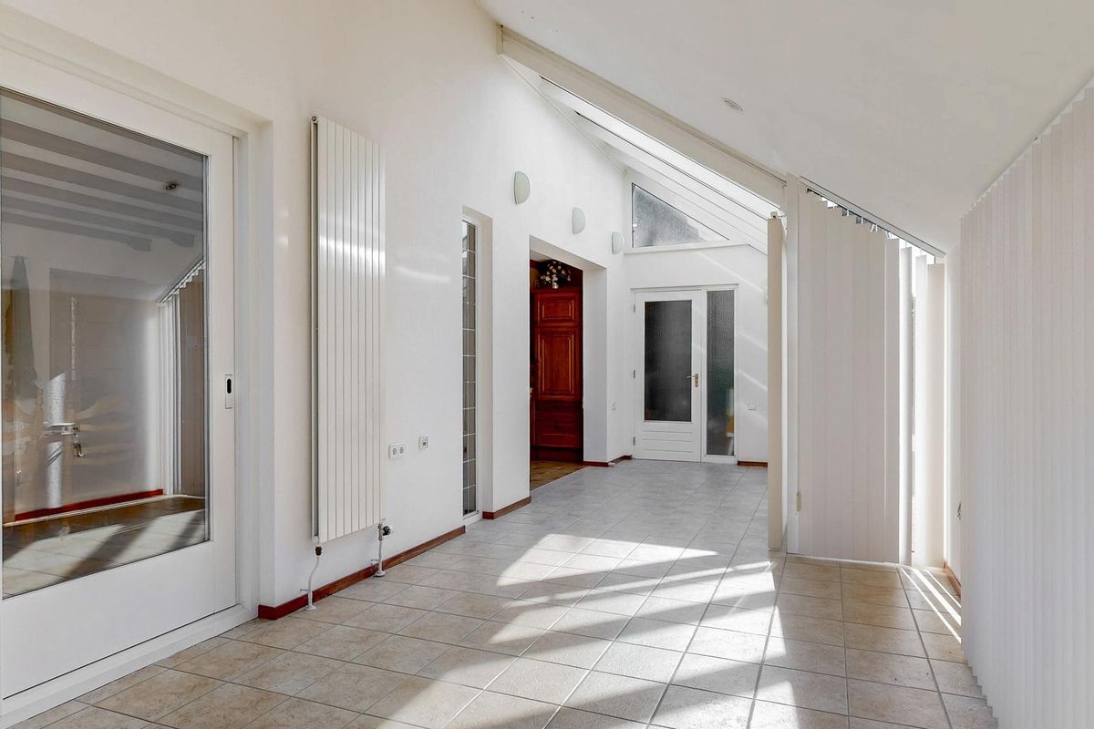 Toegang naar de aangebouwde mooie lichte tuinkamer voorzien van een lichte tegelvloer met veel licht inval en een mooi uitzicht op de achtertuin.