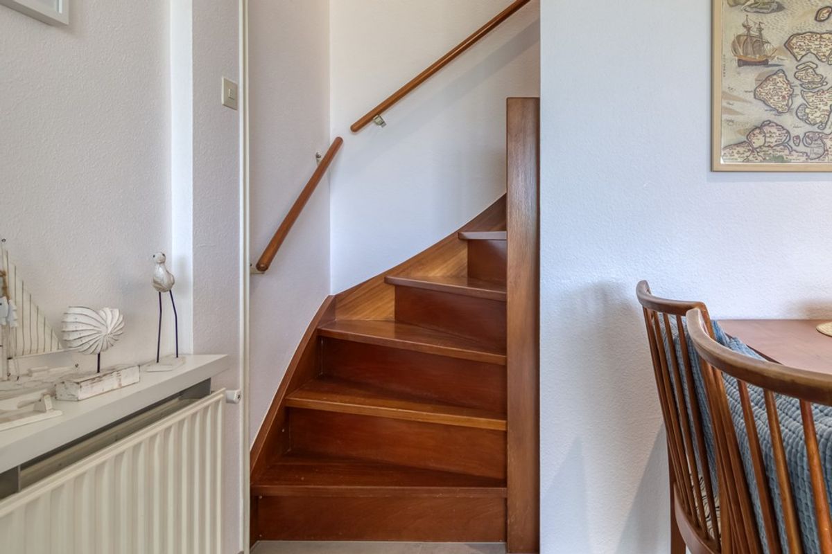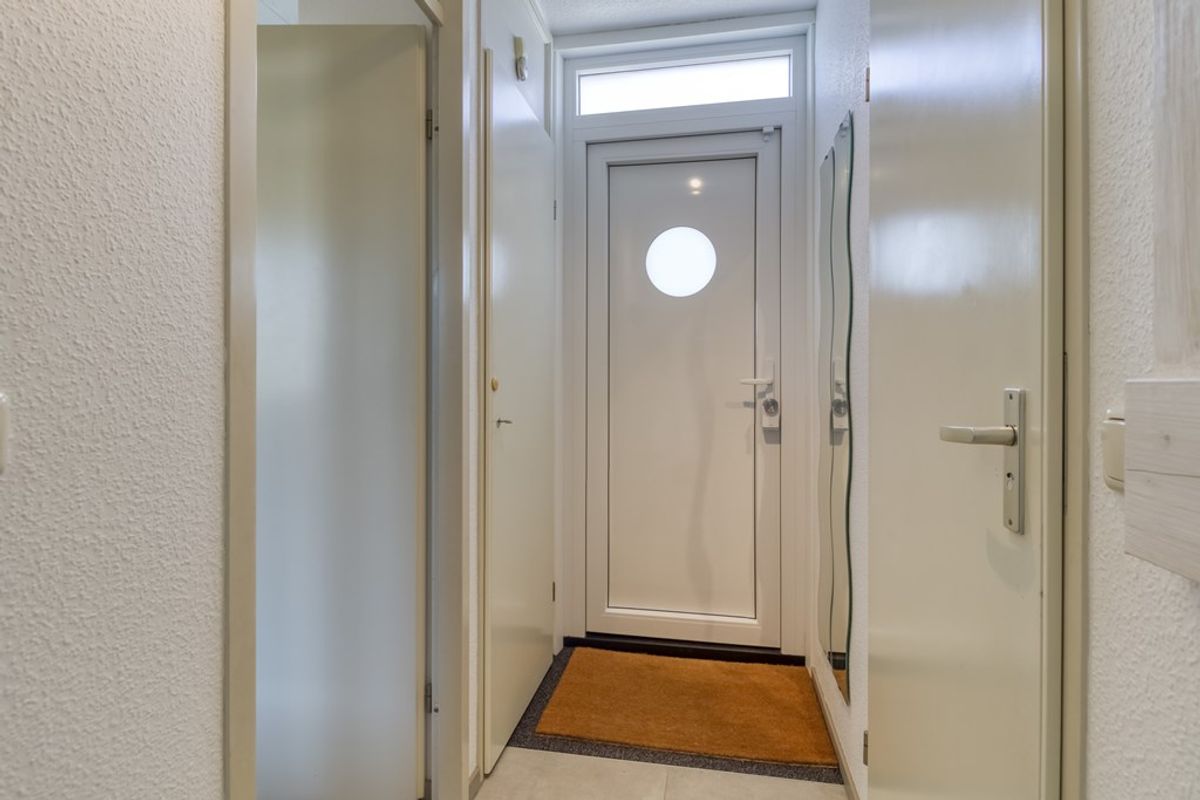 Via de entree komt u in de hal met meterkast en ruimte voor de garderobe. Vanuit de hal is er toegang tot de badkamer, de slaapkamer op de begane grond en de woonkamer. De badkamer is voorzien van douche, wastafel, toilet en wasmachine. De woonkamer met zit- en eethoek heeft een open haard, een schuifdeur naar het terras en staat in open verbinding met de keuken. De keuken is voorzien van; 4-pits inductie kookplaat, afzuigkap, spoelbak, losse koel/vriescombinatie, vaatwasmachine, oven en magnetron. Naast de keuken bevindt zich een bergruimte voor het opbergen van huishoudelijke spullen.