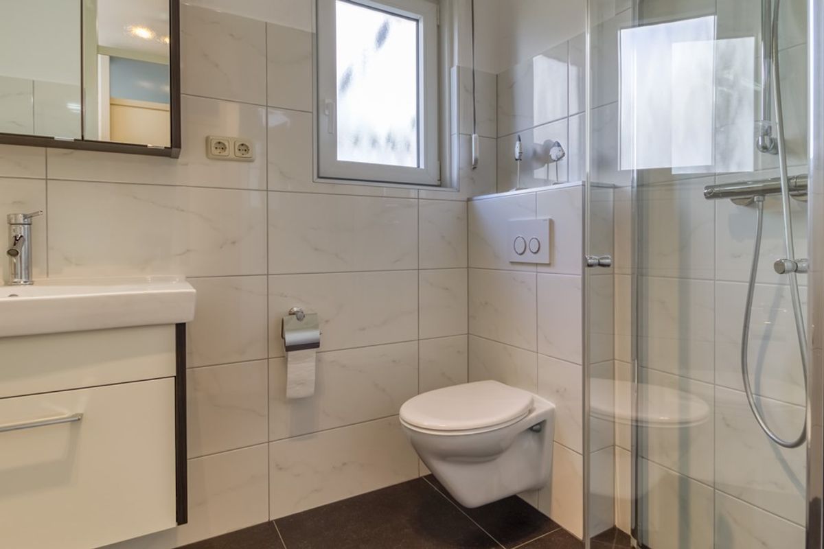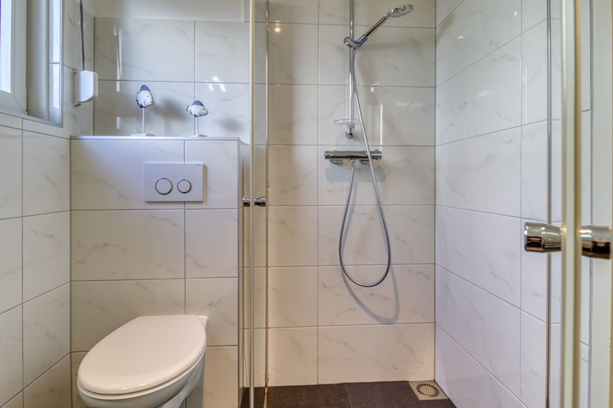 Via de trap in de woonkamer is de eerste verdieping te bereiken. Hier bevindt zich een overloop met toegang tot 2 slaapkamers en de 2e badkamer. Deze badkamer is voorzien van douche, wastafel en toilet. De trapopgang in de woonkamer kan afgesloten worden met een schuifdeur.