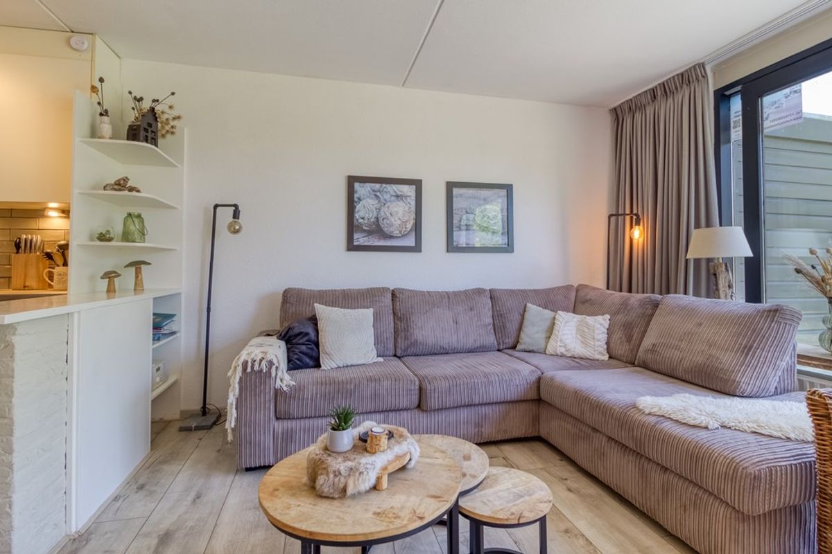 Via de entree komt u in de hal met meterkast en ruimte voor de garderobe. Vanuit de hal is er toegang tot de badkamer, een apart toilet met fonteintje en de woonkamer. De badkamer is voorzien van douche en wastafel. De woonkamer met zit- en eethoek heeft een schuifdeur naar het terras en staat in open verbinding met de keuken. De keuken is voorzien van; 4-pits gaskookplaat, afzuigkap, spoelbak, koelkast met vriesvak en vaatwasmachine. Naast de keuken bevindt zich de bijkeuken met magnetron, oven, wasmachine, droger, extra koelkast en ruimte voor het opbergen van huishoudelijke spullen.