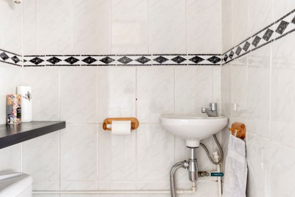 De badkamer is netjes en functioneel uitgevoerd en voorzien van een douche, wastafel en toilet.