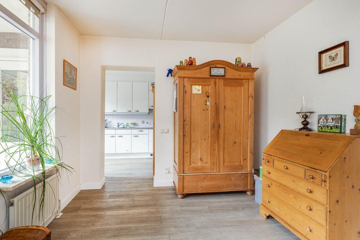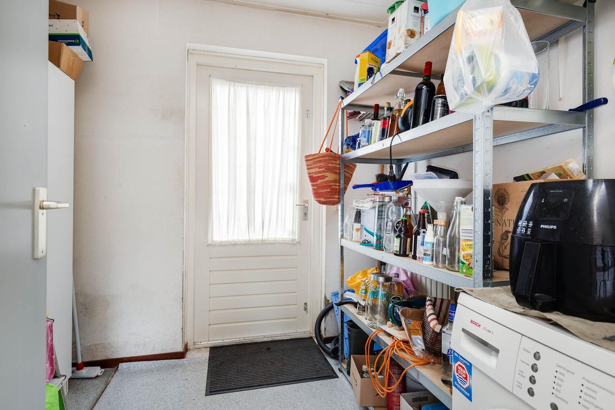 Vanuit de keuken is de tevens vanuit de oprit bereikbare berging/bijkeuken met aansluitpunt voor de wasapparatuur bereikbaar.