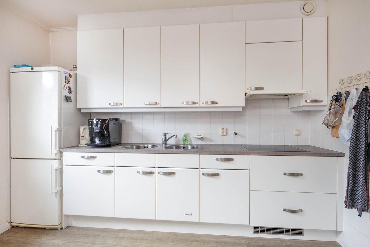 Entree, hal met meterkast, garderobe en toilet. Royale U-vormige woonkamer met vinyl vloerafwerking. Nagenoeg gesloten keuken met een keukeninstallatie met inductie kookplaat en afzuiging.