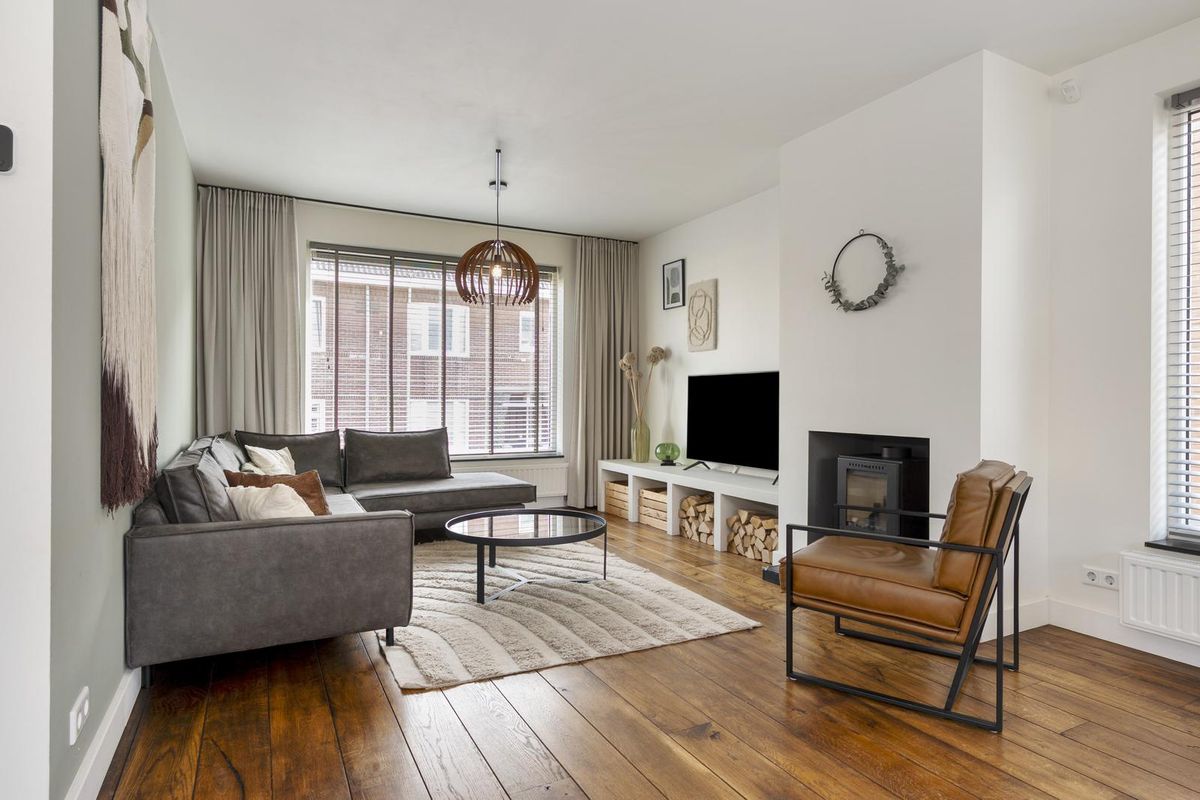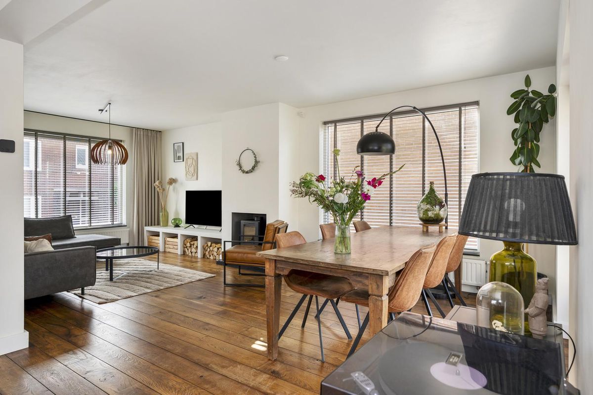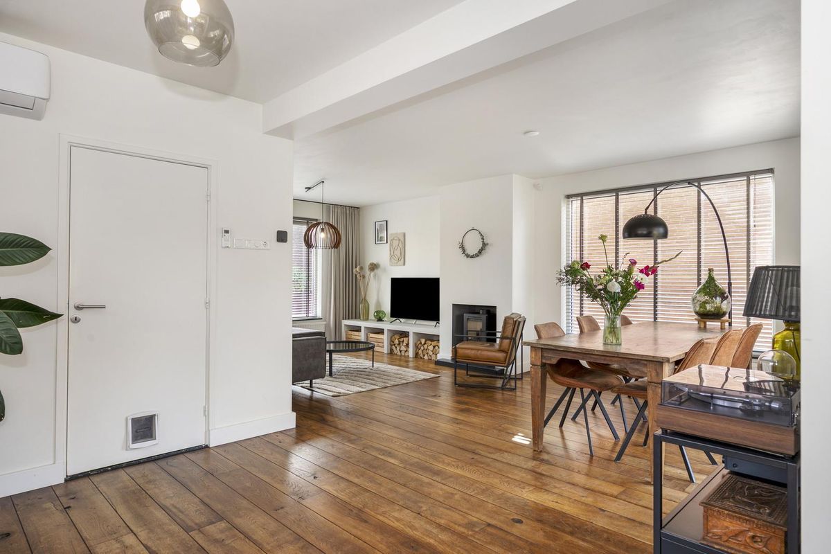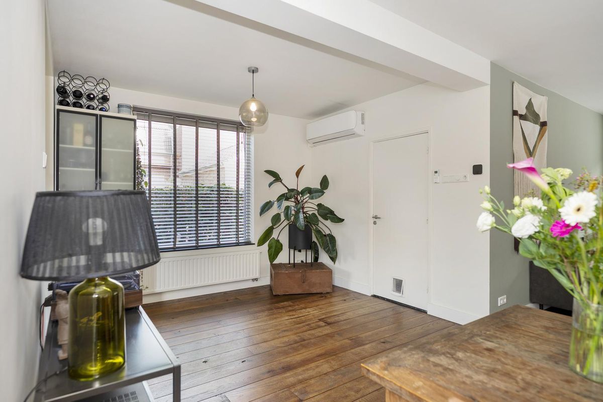 Sfeervolle woonkamer 3.73/6.61/7.44 met eiken parketvloer, tuindeuren, airco en aansluitpunt voor houtkachel/open haard.