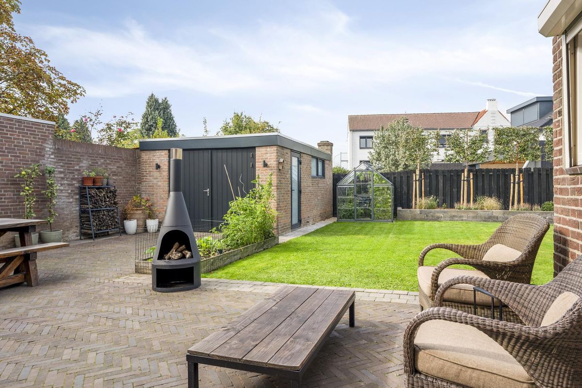 Goed omheinde en aangelegde tuin. Oprit met poort naar de tuin en garage 6.18/3.34. De tuin is voorzien van een terras, borders, gazon en leibomen.
