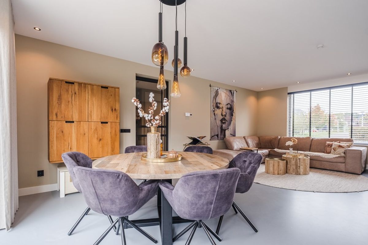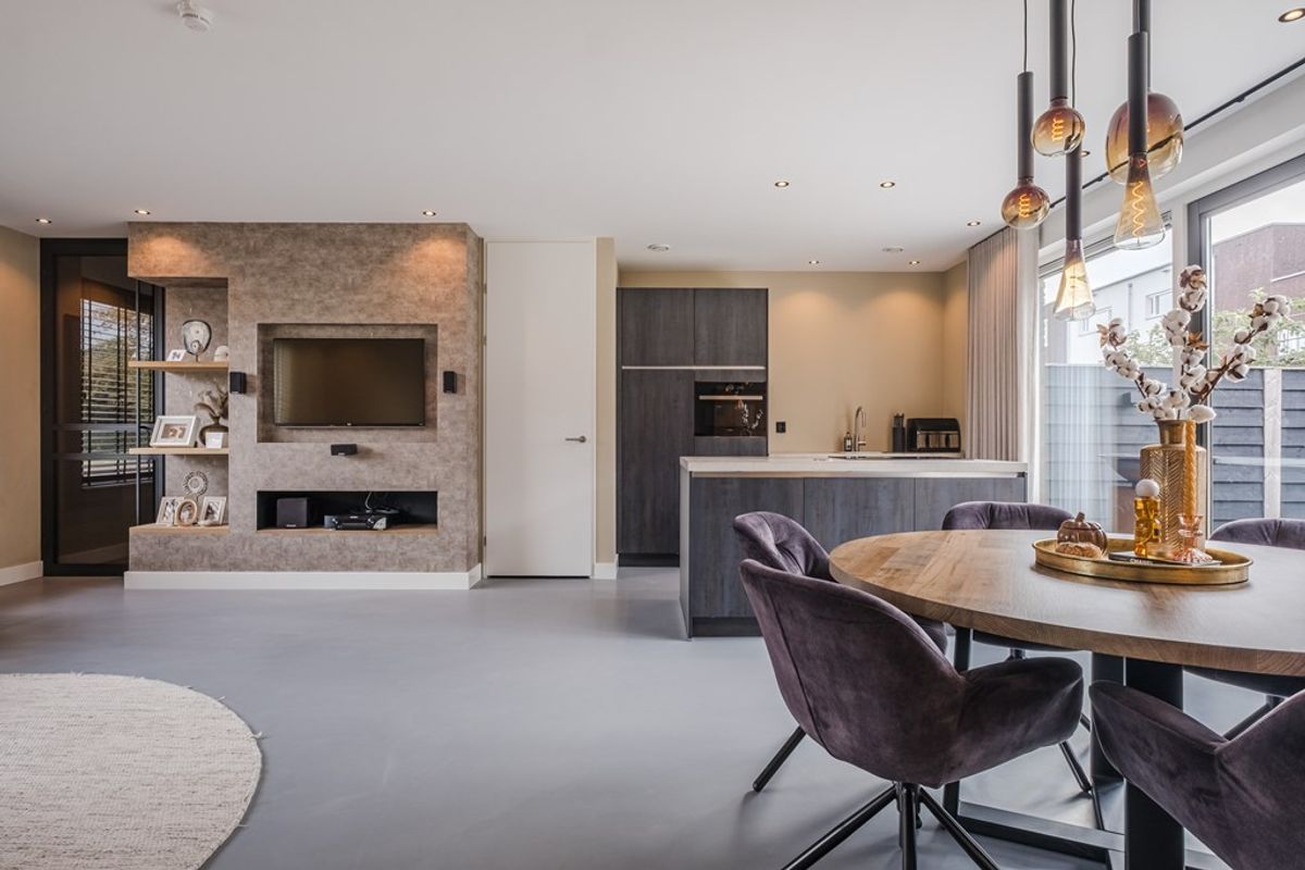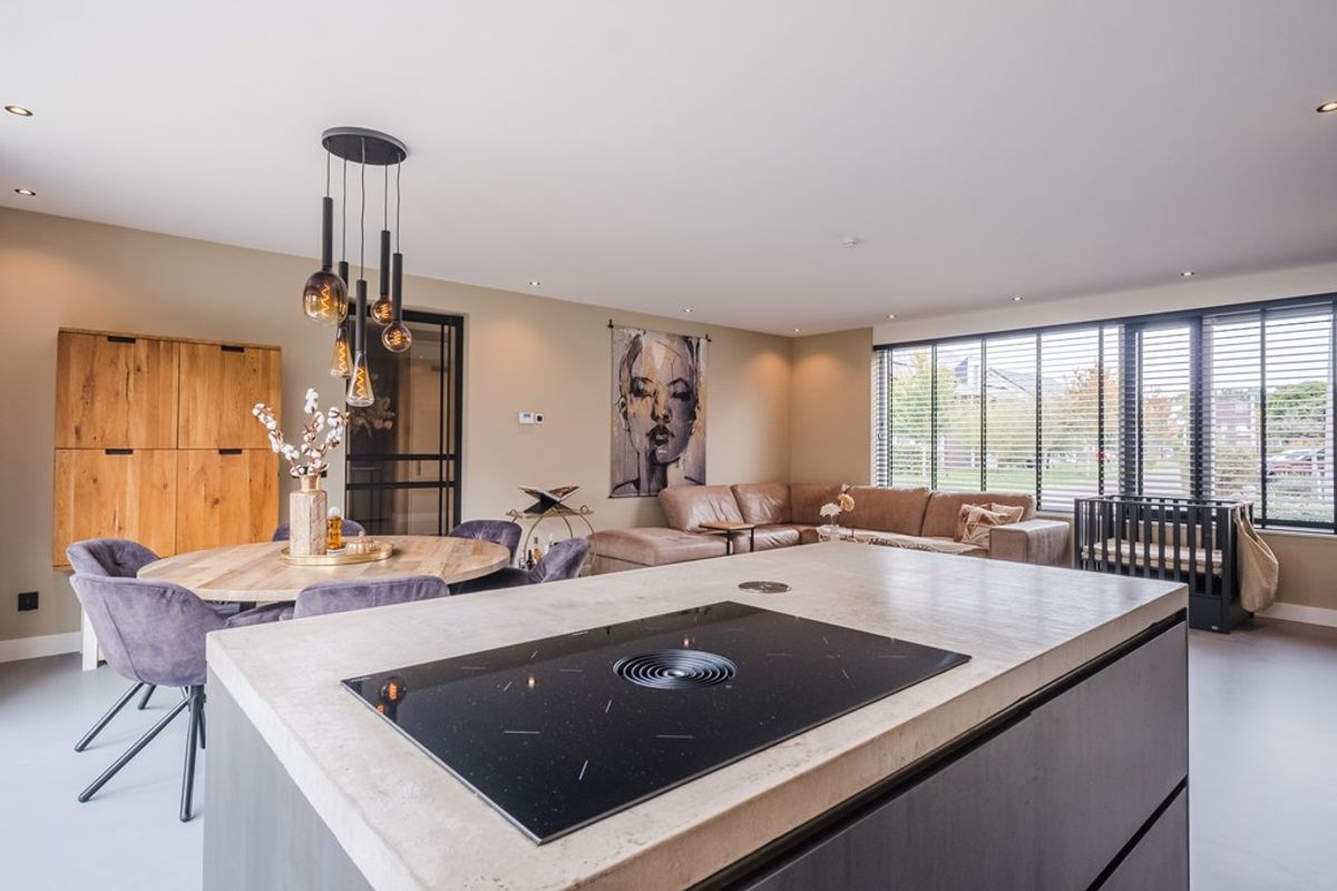 De ruime woonkamer is licht en sfeervol dankzij de grote raampartijen. De open keuken is voorzien van diverse kwalitatieve inbouwapparaten en vormt een fijne plek om te koken, te eten en samen te zijn. Vanuit de woonkamer bereik je een portaal met de trapopgang naar de eerste verdieping.