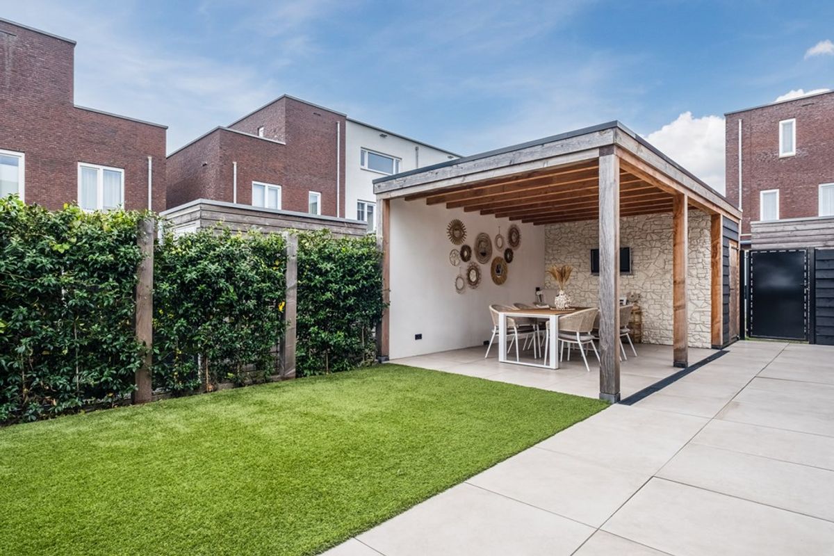 De achtertuin is onderhoudsvriendelijk aangelegd en voorzien van een luxe overkapping. Daarnaast is er een compacte berging aanwezig voor fietsen en/of tuingereedschap. De tuin is bovendien via twee achteringangen bereikbaar, wat zorgt voor extra gemak.