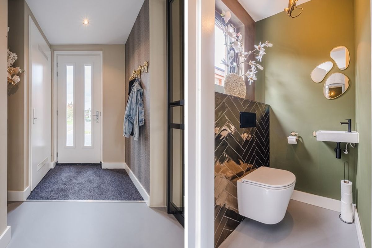 Via de nette entree kom je in de hal met toiletruimte, meterkast en toegang tot zowel de bijkeuken als de woonkamer. In de bijkeuken vind je de technische installaties en extra bergruimte – praktisch en netjes weggewerkt. De bijkeuken is ook eenvoudig vanaf de oprit te bereiken, ideaal voor bijvoorbeeld het stallen van fietsen.